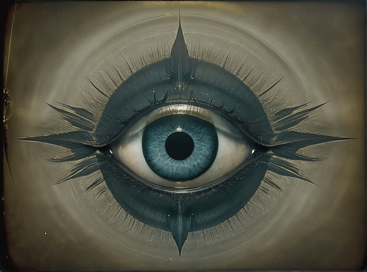 An artistic depiction of a large, detailed blue eye surrounded by intricate, sharp patterns, resembling a compass design. The eye's deep gaze contrasts with the dark, stylized elements.