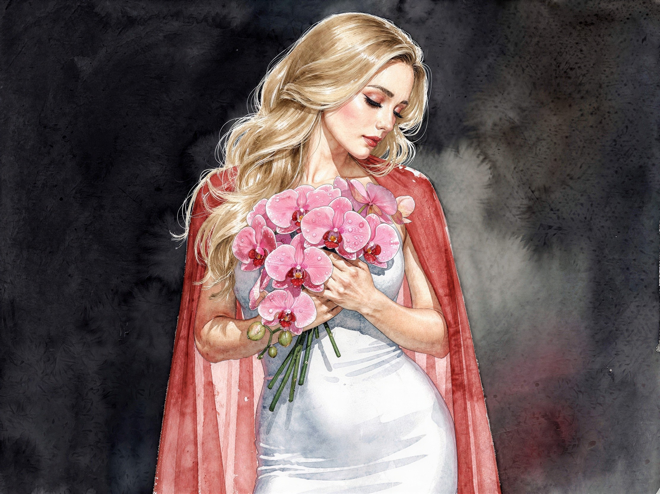 A watercolor illustration depicts a woman with long wavy blonde hair, light skin, and delicate features, holding a bouquet of pink orchids against her chest. She is wearing a white dress and a red or coral colored cape that is draped over her shoulders and down her back. Her head is tilted downwards, and
