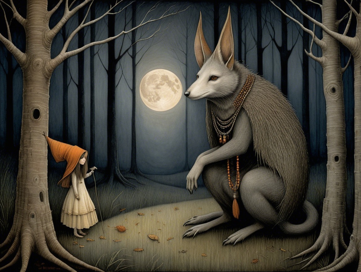 A surreal painting with two robed figures, one standing and touching a moon orb, the other seated, under a moonlit sky amidst trees.