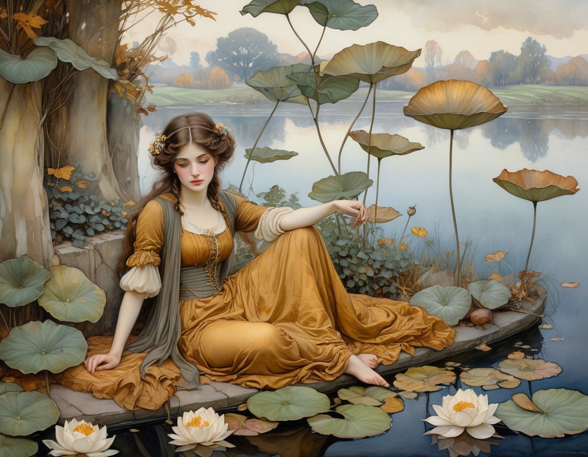 A serene young woman in a flowing golden dress sits by a tranquil lake, surrounded by autumn foliage and pumpkins, exuding a dreamy, fairy-tale atmosphere. Soft colors enhance the peaceful scene.