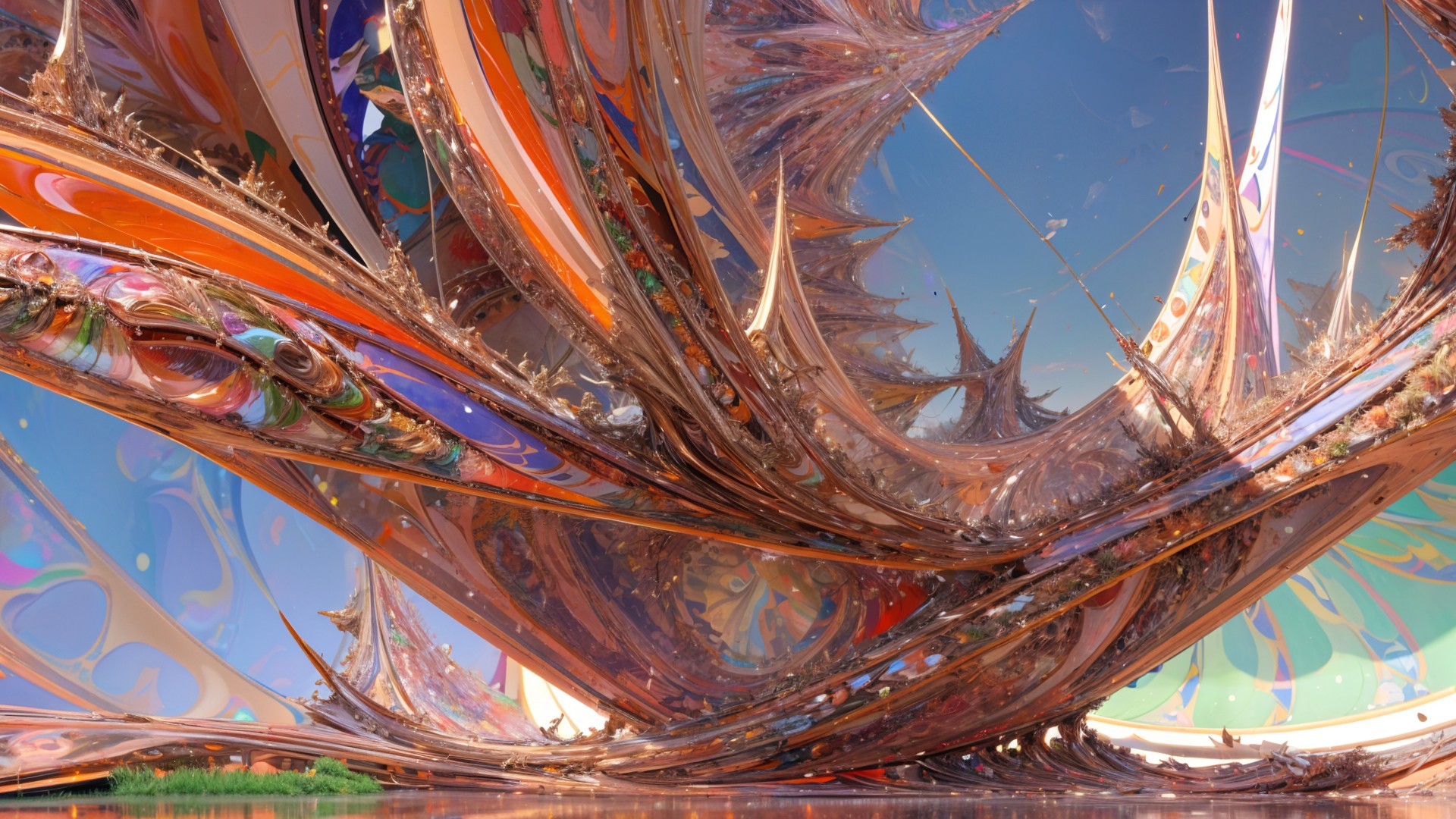 A surreal landscape features vibrant, swirling pink and orange formations resembling soft, flowing mountains, reflected in a serene body of water under a bright, blue sky.