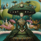 A whimsical, surreal scene featuring a regal figure in an ornate green gown, surrounded by fantastical creatures, playful bubbles, and vibrant landscapes dotted with floating orbs and structures.