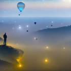 A solitary figure stands on a rocky outcrop, gazing at floating hot air balloons in a misty landscape. Stars shimmer above rolling hills, creating a serene, dreamlike atmosphere.