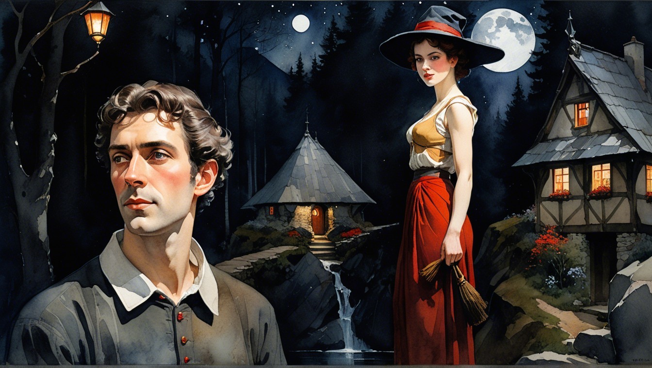 A stylized painting of two women by a cottage near a forest at night, with a full moon and an arched stone bridge in the background.