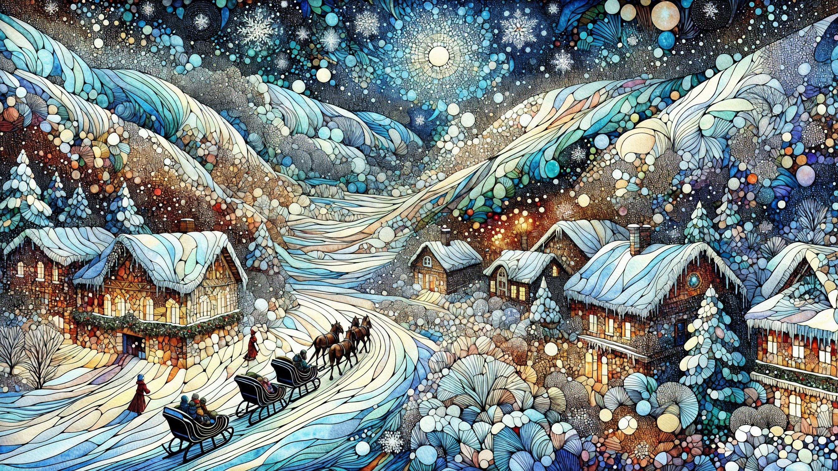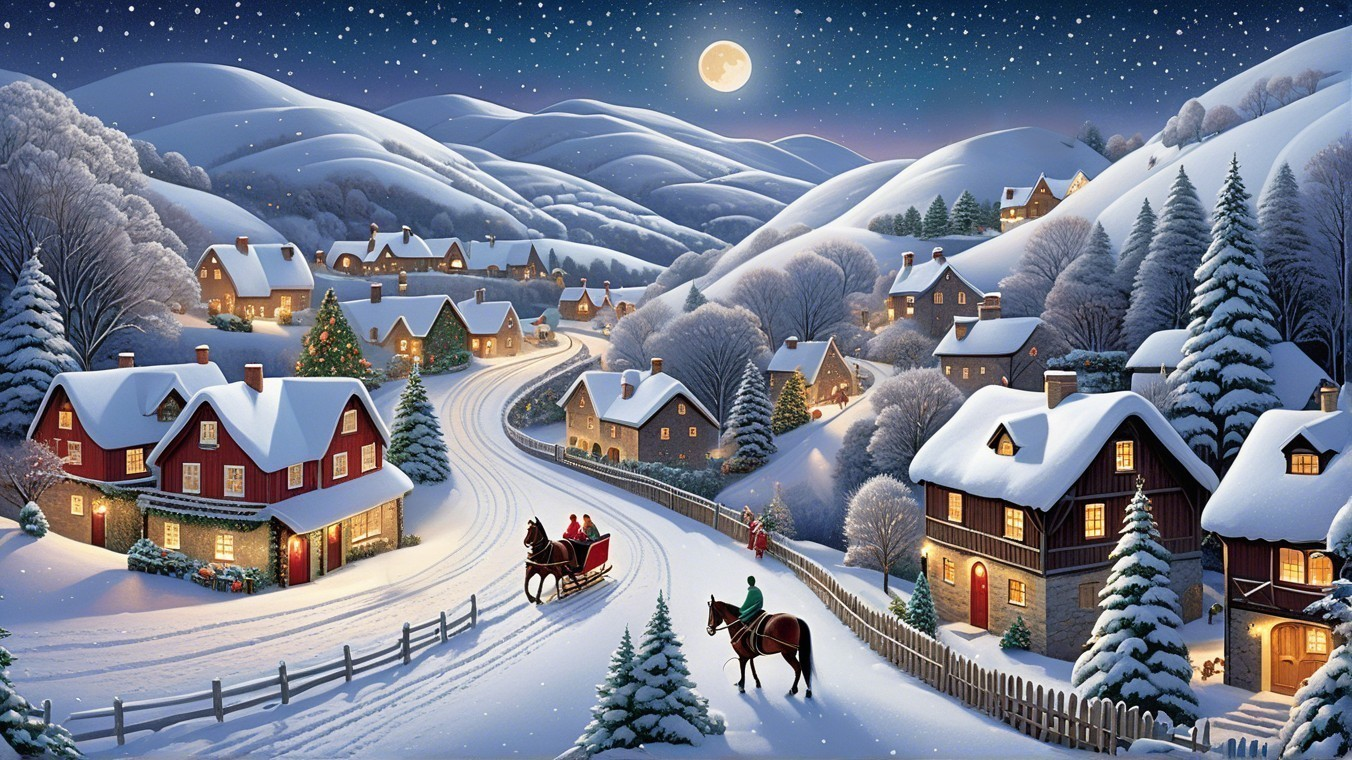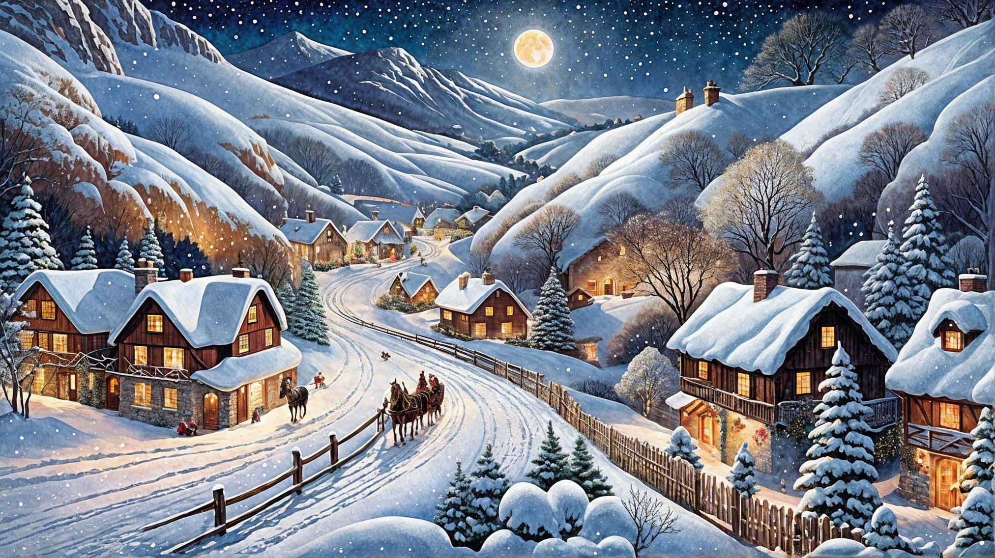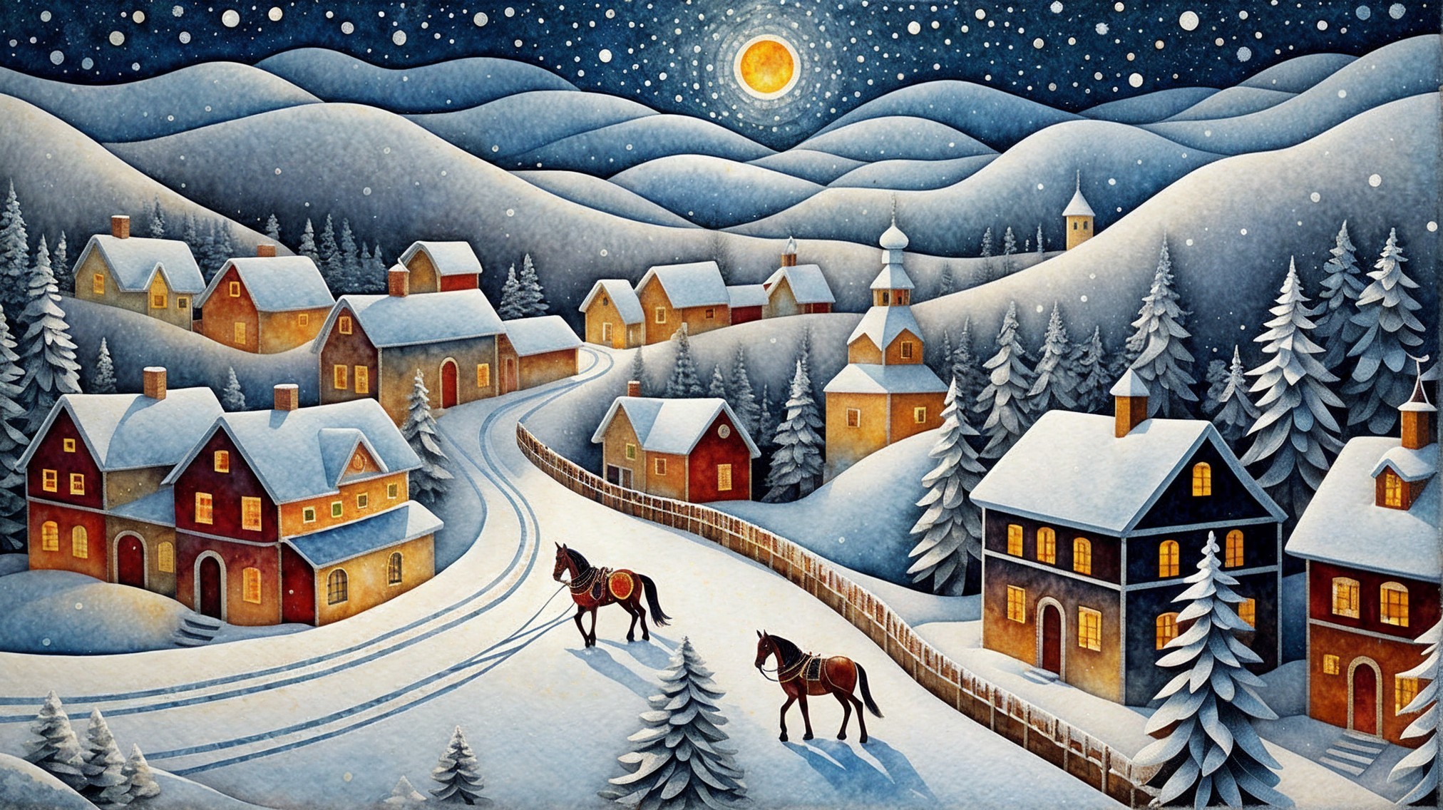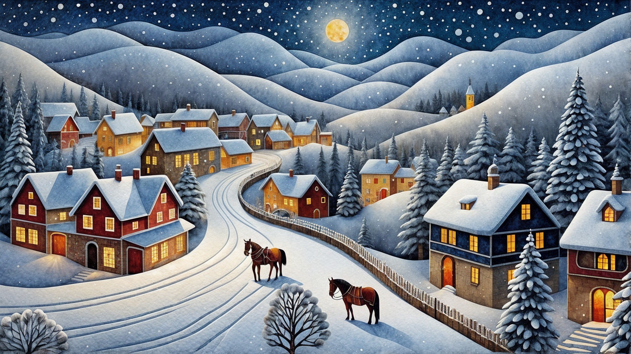 Houses with glowing windows, snow-covered hills, and two riderless horses trotting along a winding path under a bright moonlit sky. I couldn't get the sleigh in the final evolve. :)