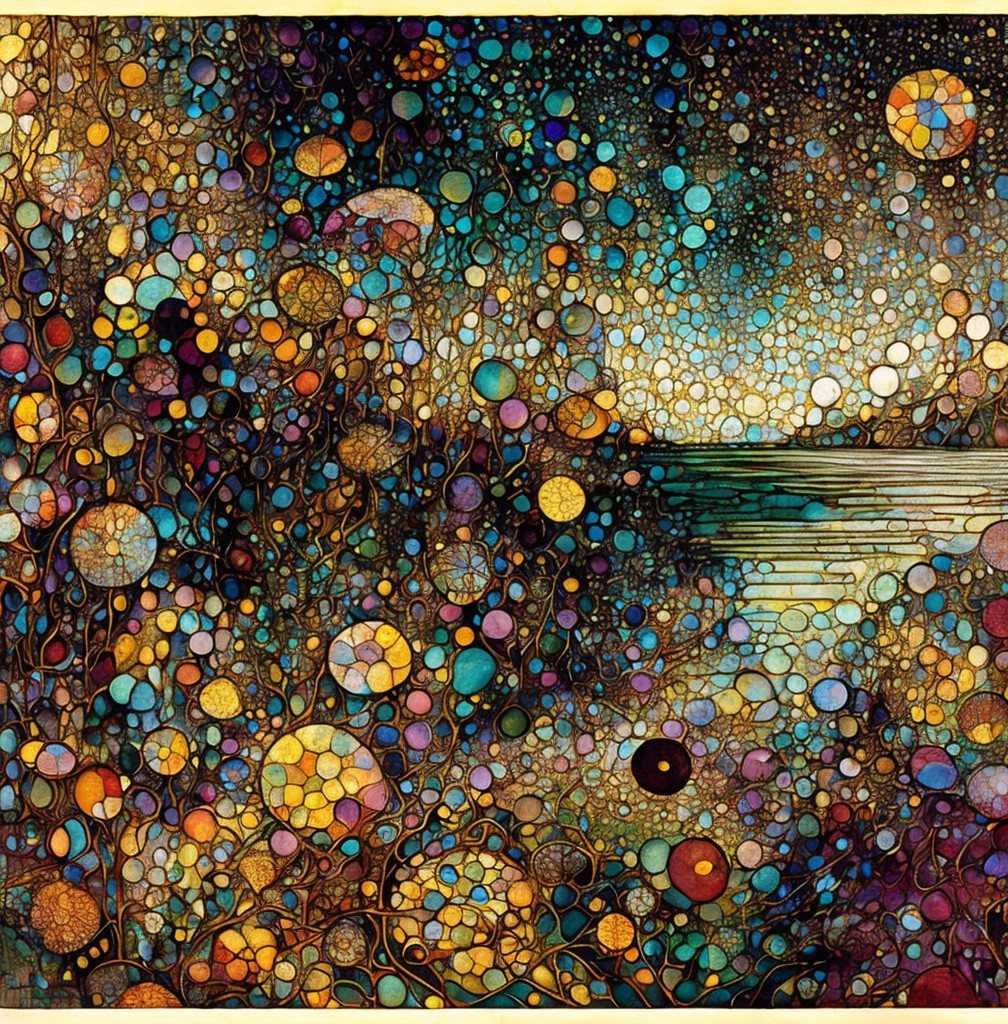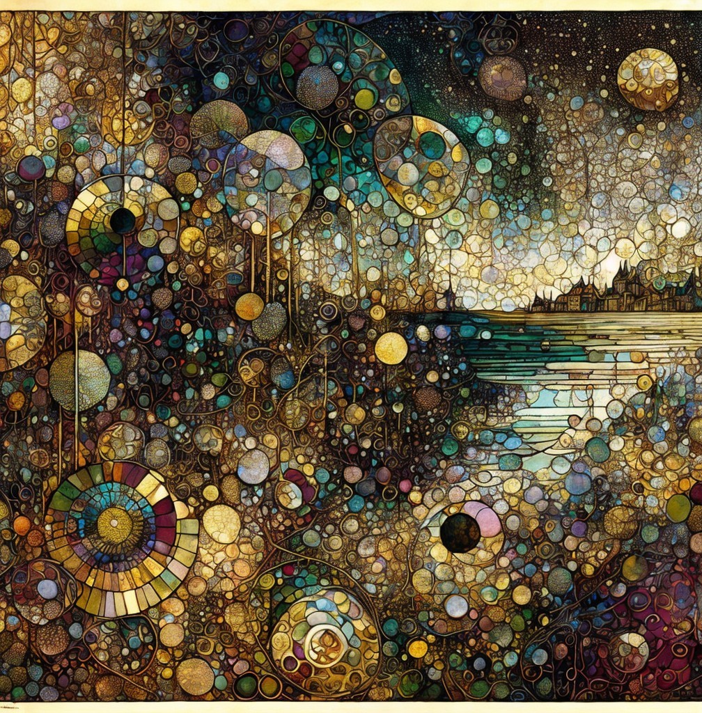 The scene depicts a serene riverside at night, with colorful houses reflected in the water. A lone figure under a red umbrella stands amidst autumn leaves, illuminated by stars and a glowing moon.