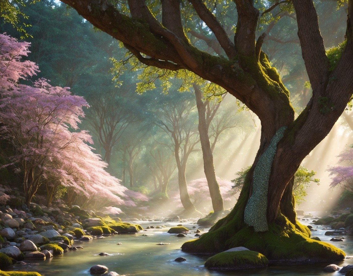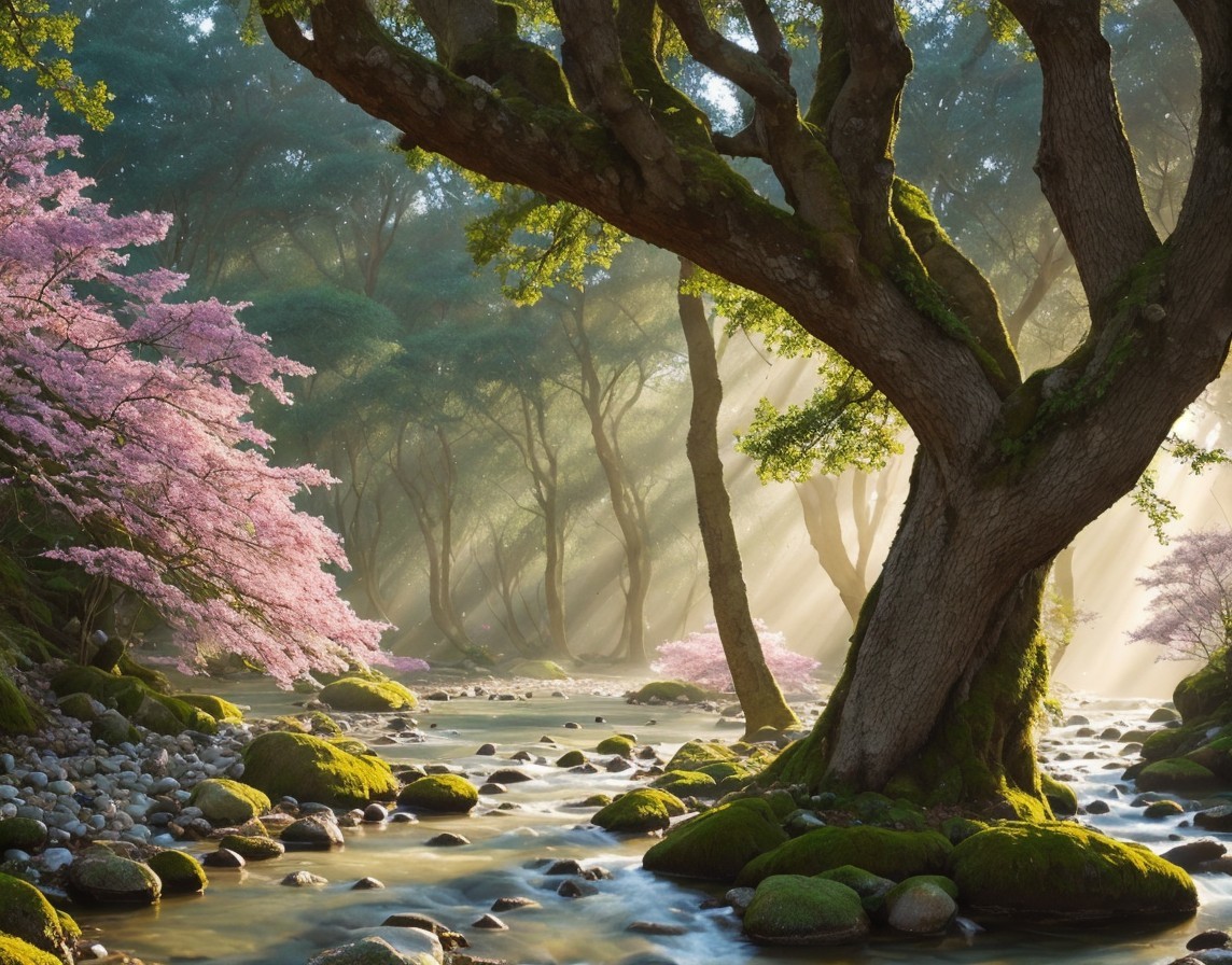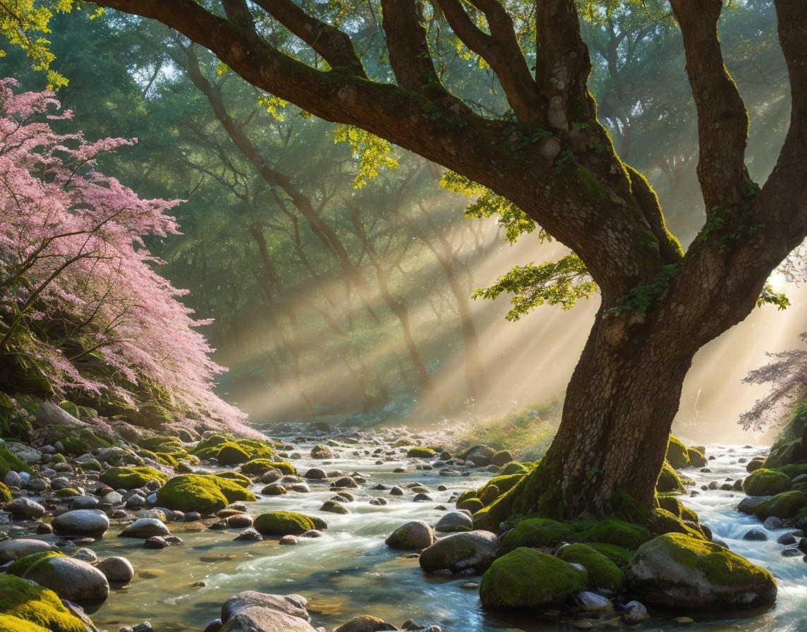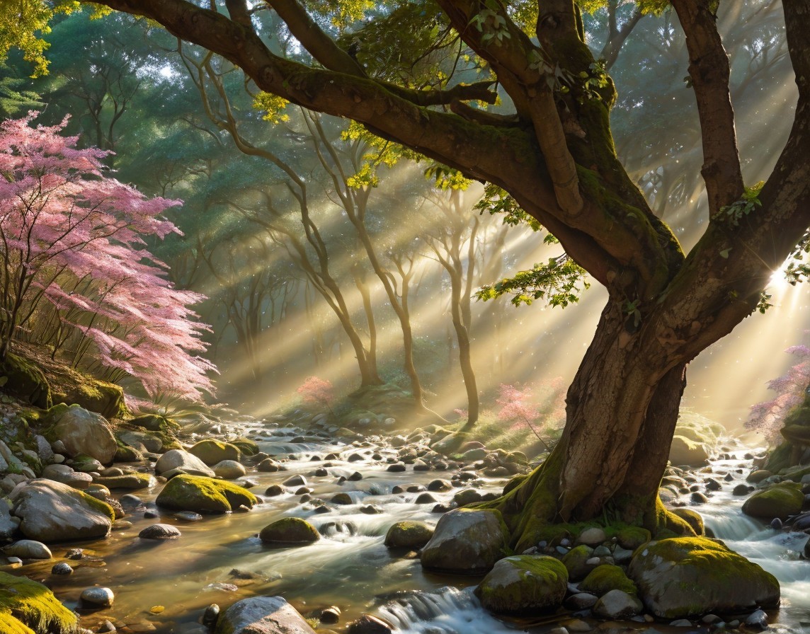 A tranquil forest scene with sunbeams filtering through trees, and a serene stream surrounded by rocks.
