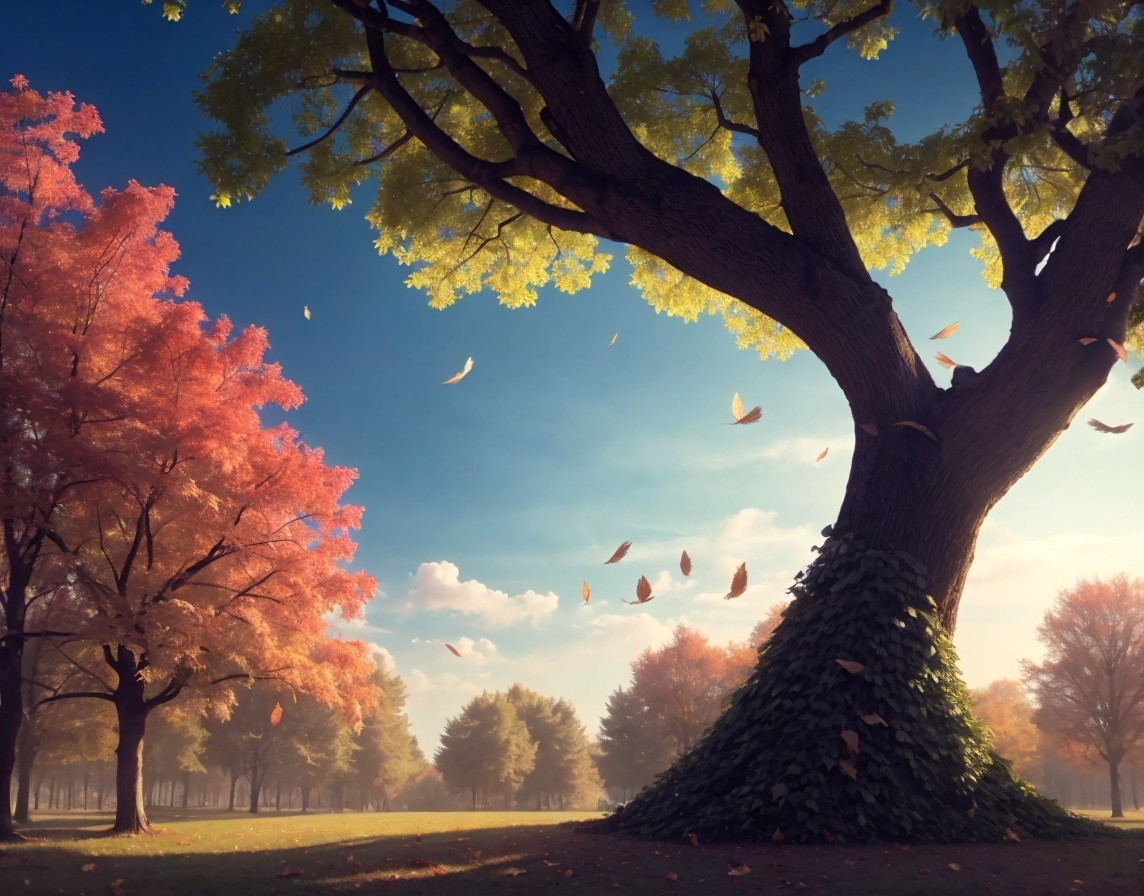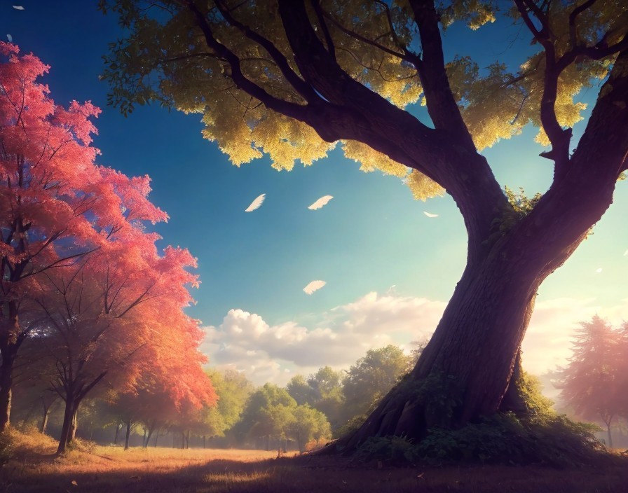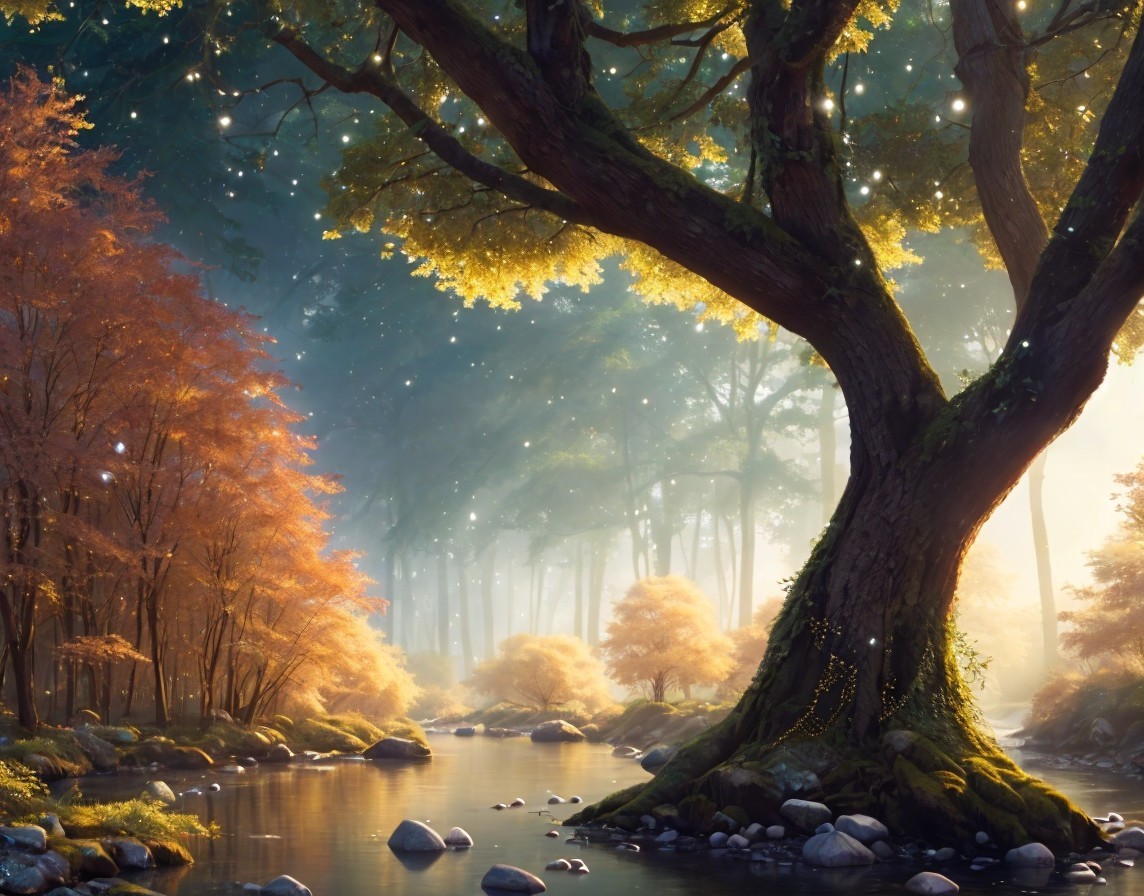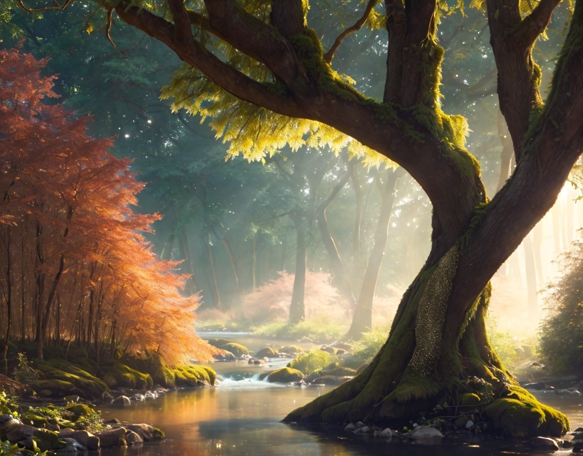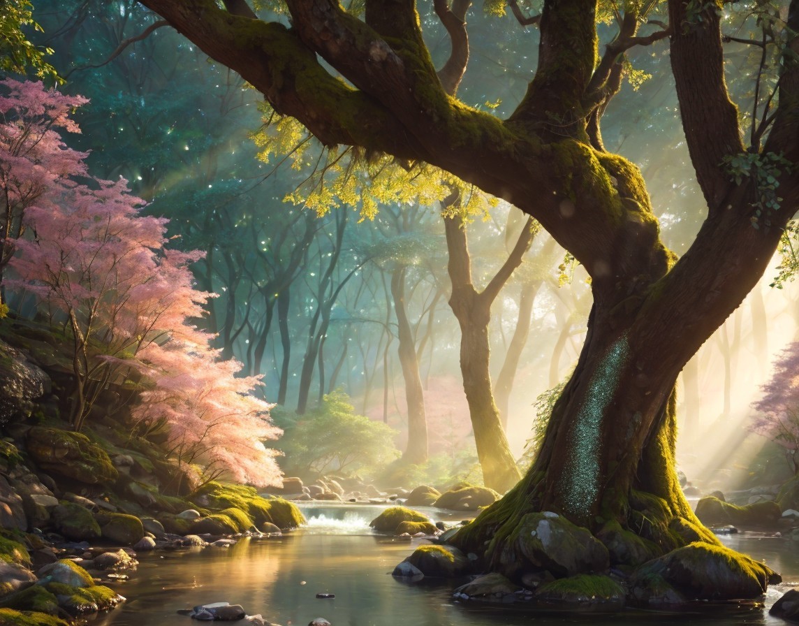 A tranquil forest scene with sunbeams filtering through trees, and a serene stream surrounded by rocks.
