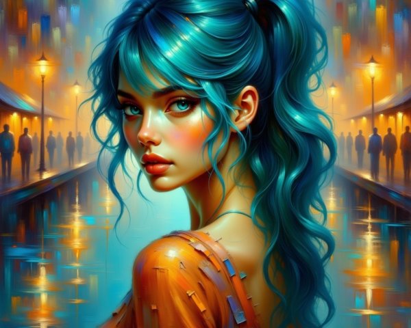 A young woman with a stunning flower crown composed of vibrant daisies, tulips, and blossoms, set against a soft blue background, radiating beauty and freshness.