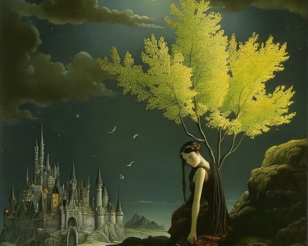 A surreal scene features a whimsical, colorful house with a tower, partially submerged in calm water under a moonlit sky. Rich purples and yellows create an ethereal atmosphere.