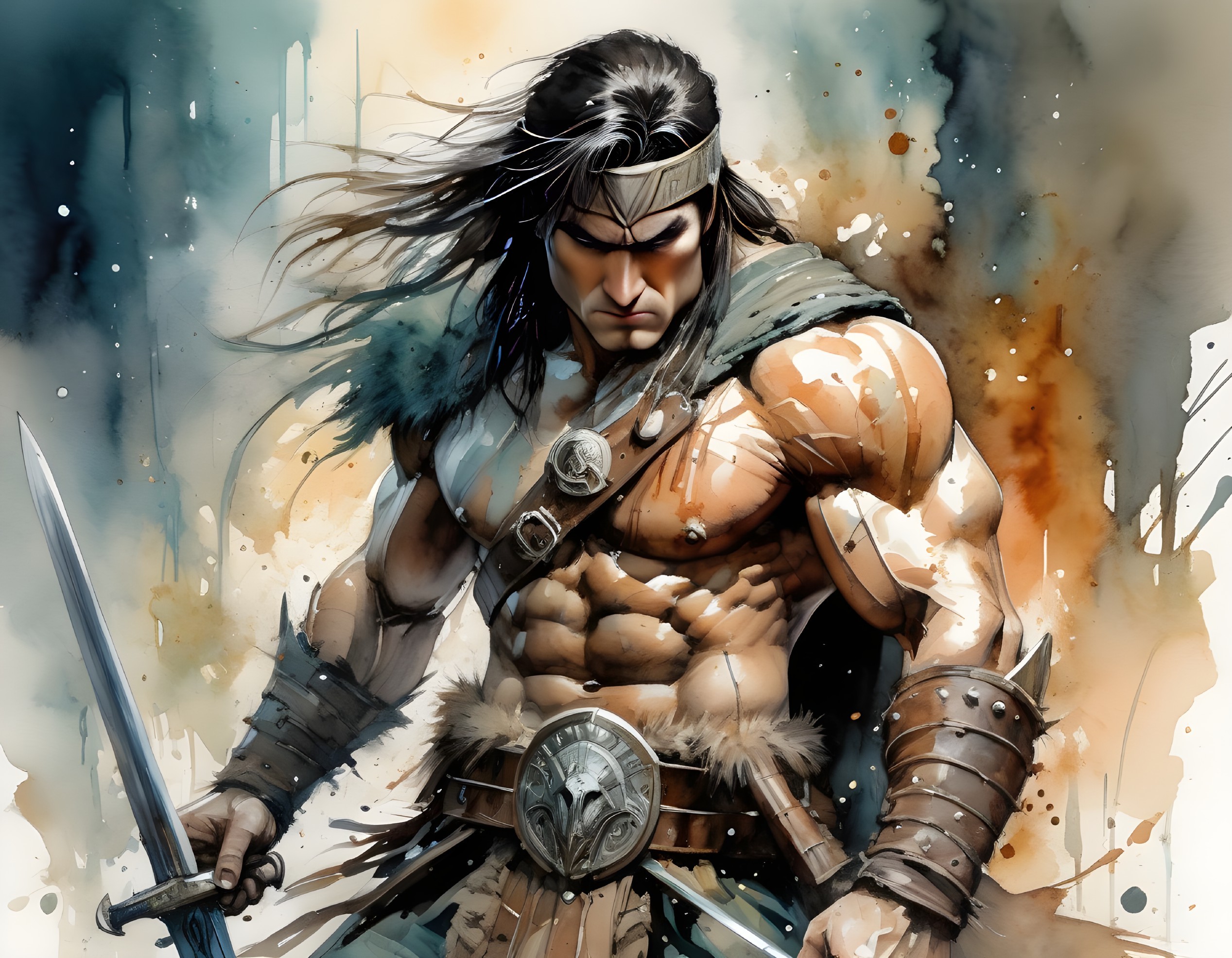 A fierce warrior brandishing a sword, depicted in a stunning watercolor masterpiece with intricate details, sharp contrasts, and cinematic lighting. The artwork features a dramatic long shot of the warrior with wild hair, creating a visually captivating piece.
