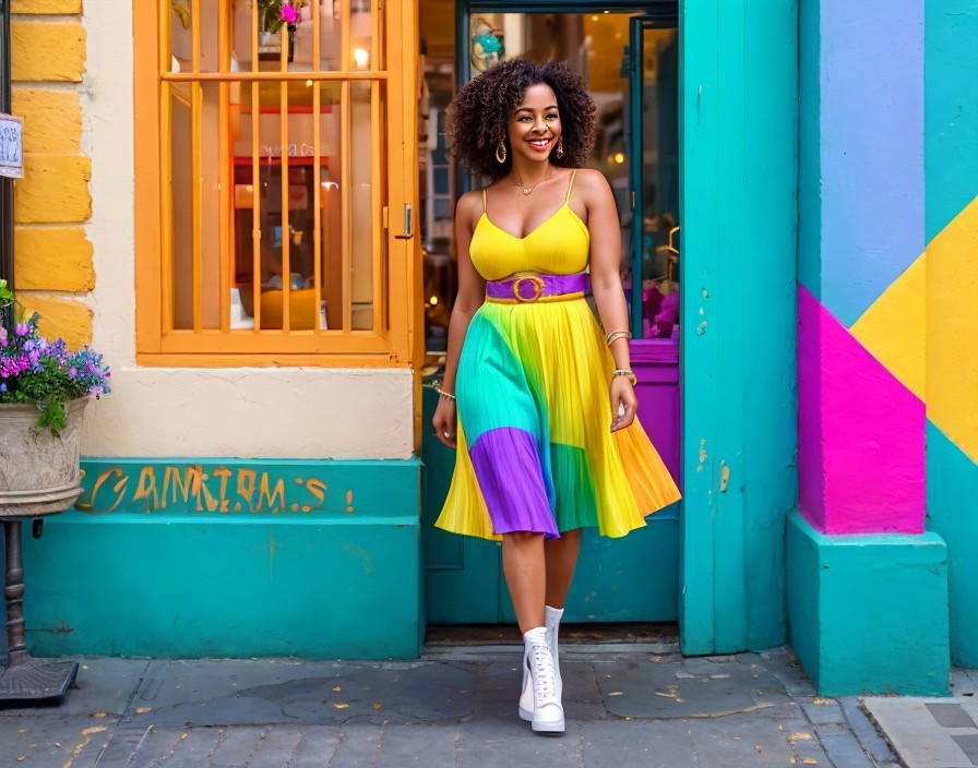 A woman in yellow attire poses by a blue wall and yellow door, with vibrant flowers adding to the cheerful color palette.