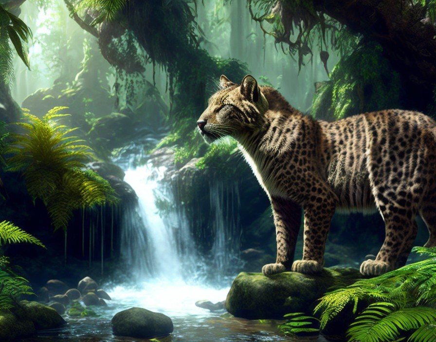A majestic ocelot stands on a rock amid a lush jungle with cascading waterfalls in the background.