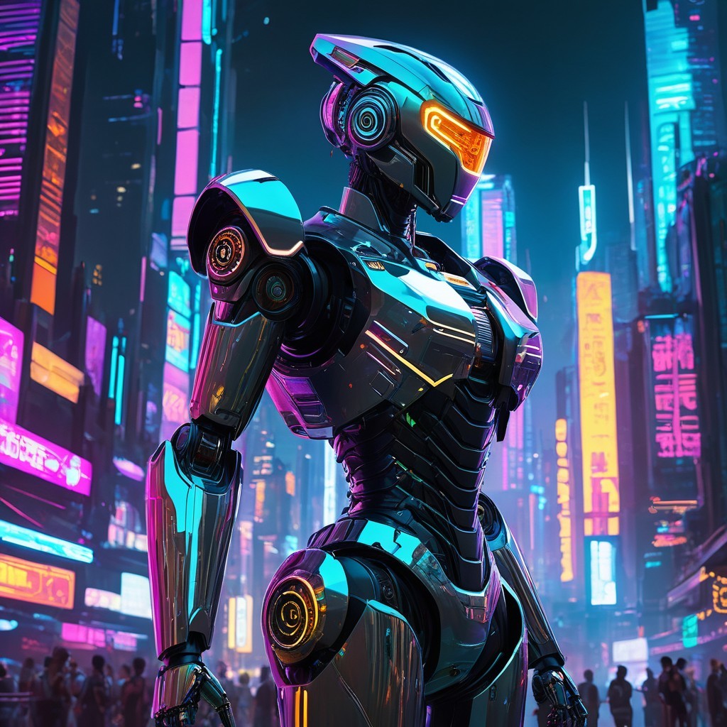 A futuristic robot with a sleek design stands against a neon-lit cityscape, evoking a cyberpunk vibe.