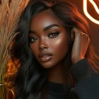 A young woman with long, wavy hair sits against a softly lit backdrop. The warm, orange glow complements her radiant skin, creating an inviting and serene atmosphere.