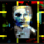 An abstract art piece featuring a fragmented portrait of a woman, blending vibrant colors like blue, yellow, and black, arranged within a geometric framework. It evokes a modern, surreal vibe.