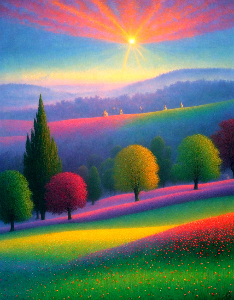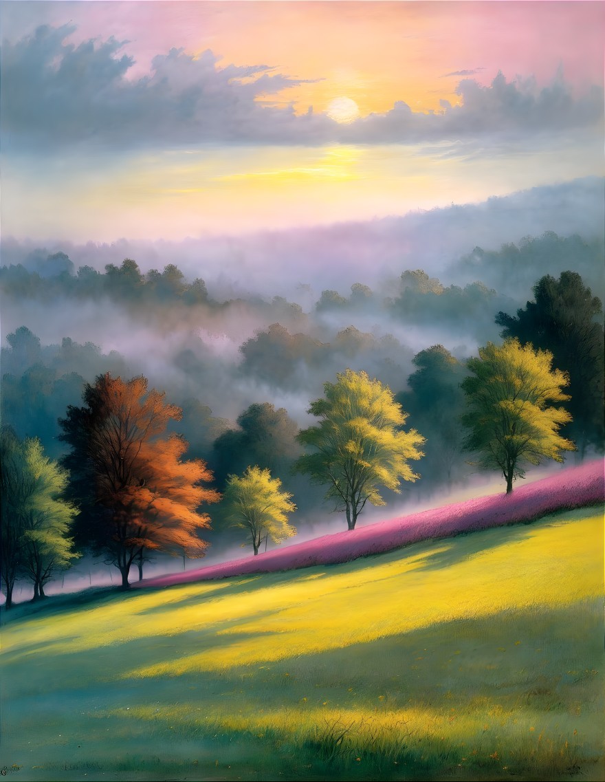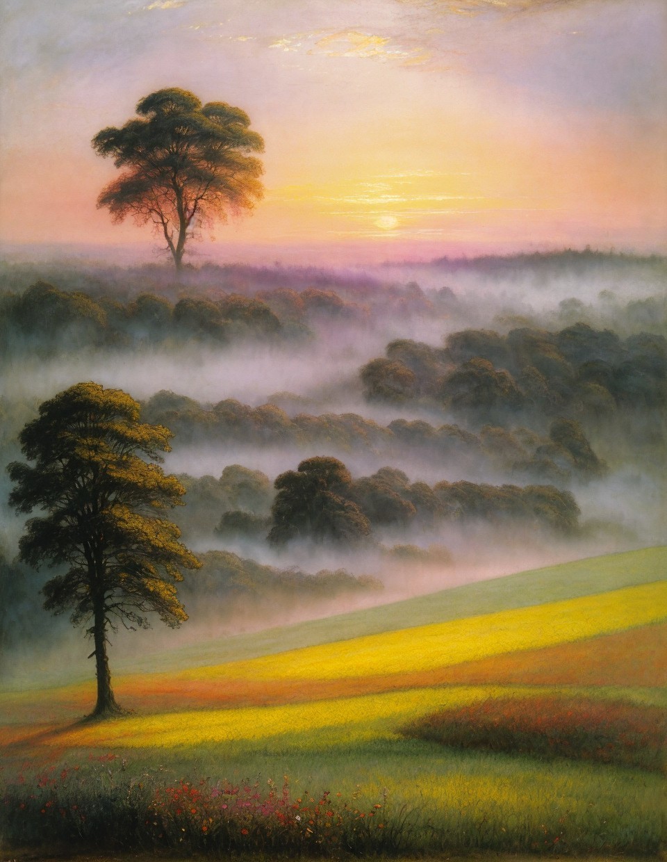 Prompt: oil on canvas, beautiful mist sunset over colorful fields and colorful trees. Harmonized mix of bold and pastel colors. Perfect composition. By Arthur Rackham and William Turner.