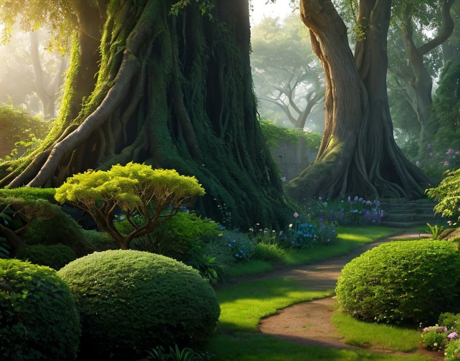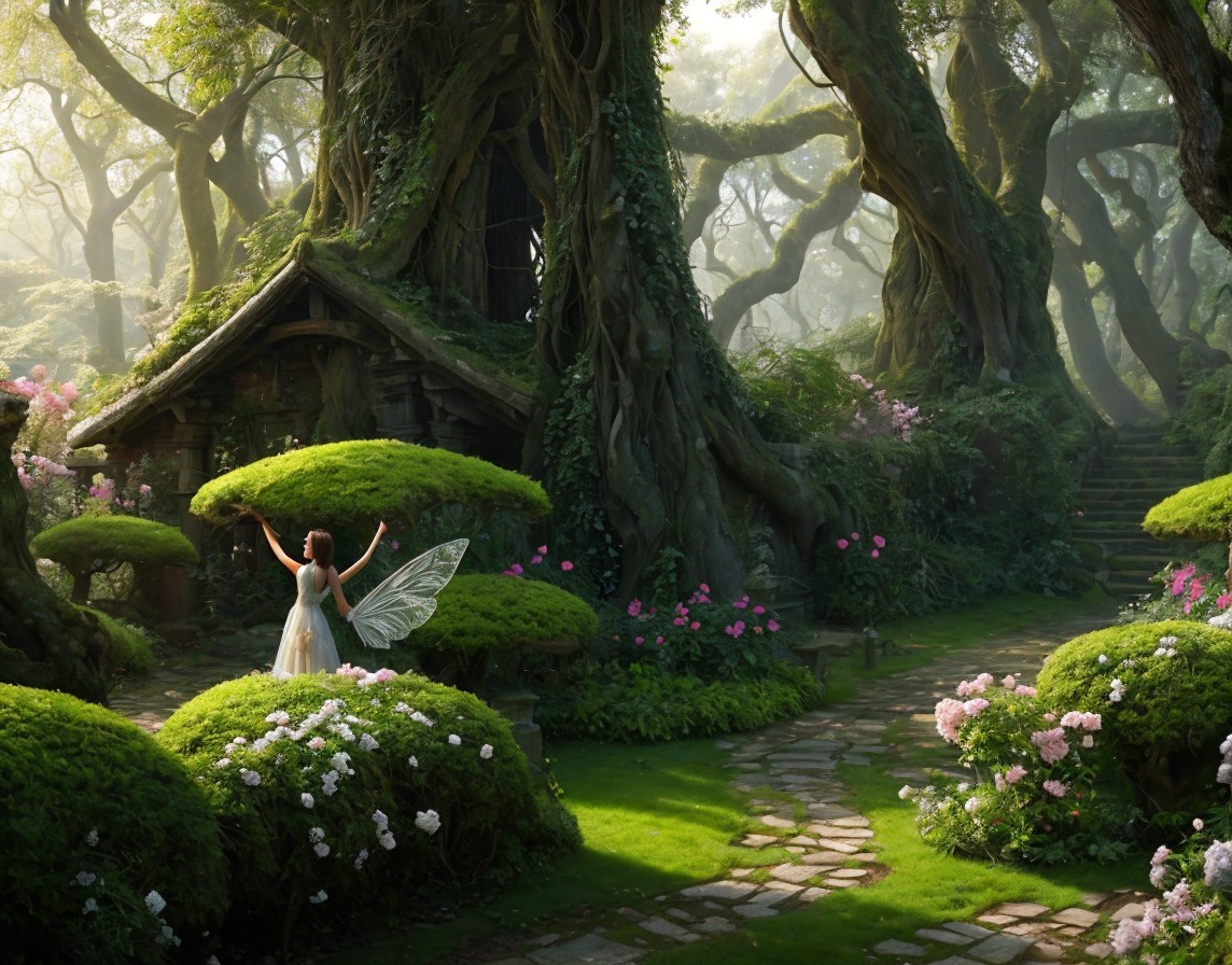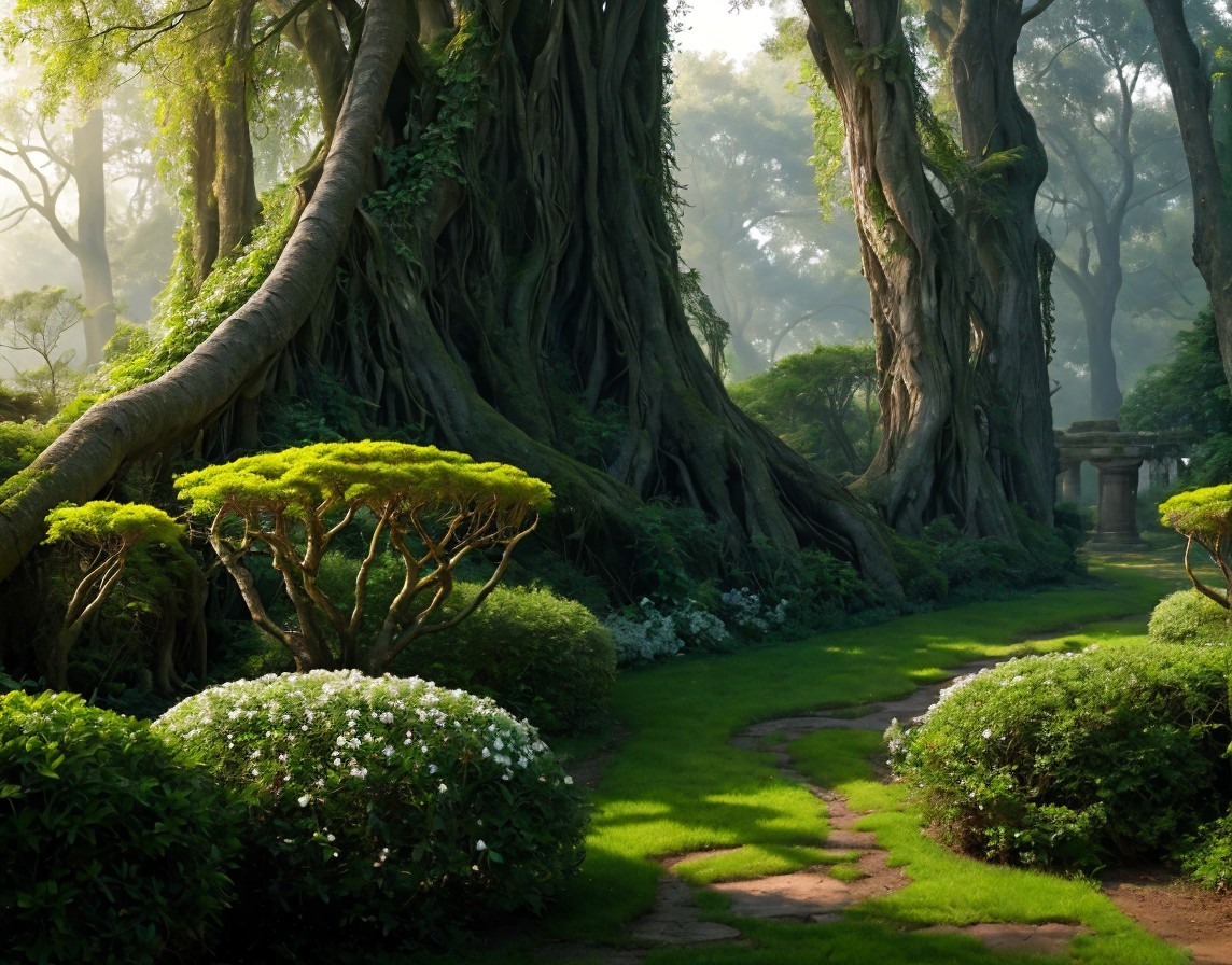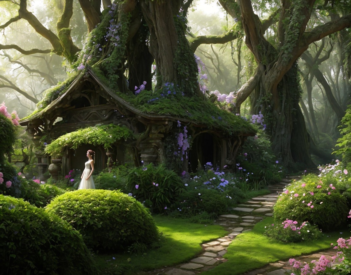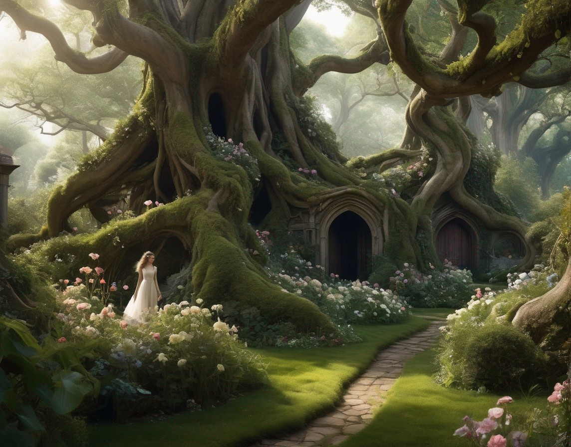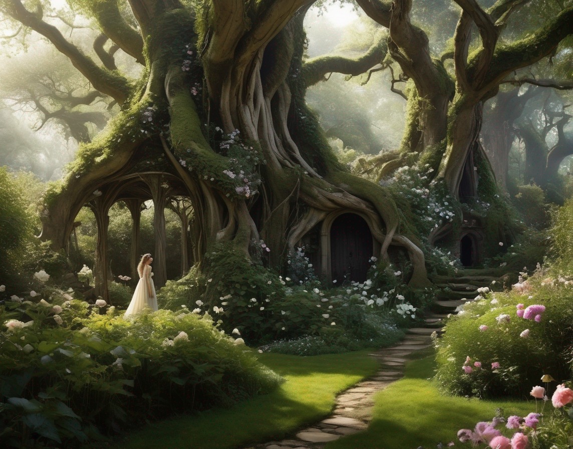 "A woman in a white dress stands in a mystical forest with large trees and red flowers, sunlight filtering through the leaves."