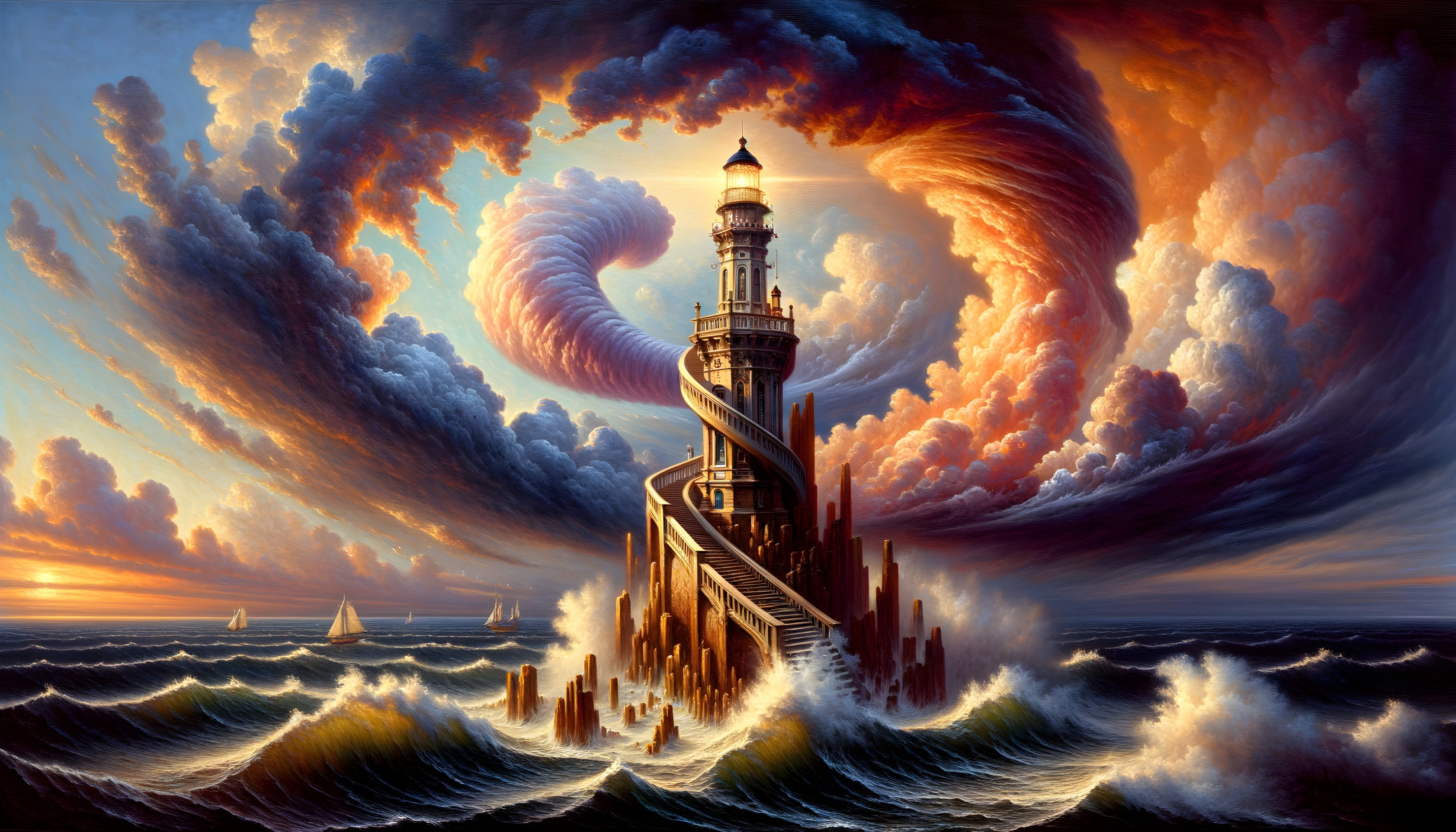 A majestic lighthouse stands amidst swirling clouds and turbulent waves, its beacon shining as ships sail in the distance.