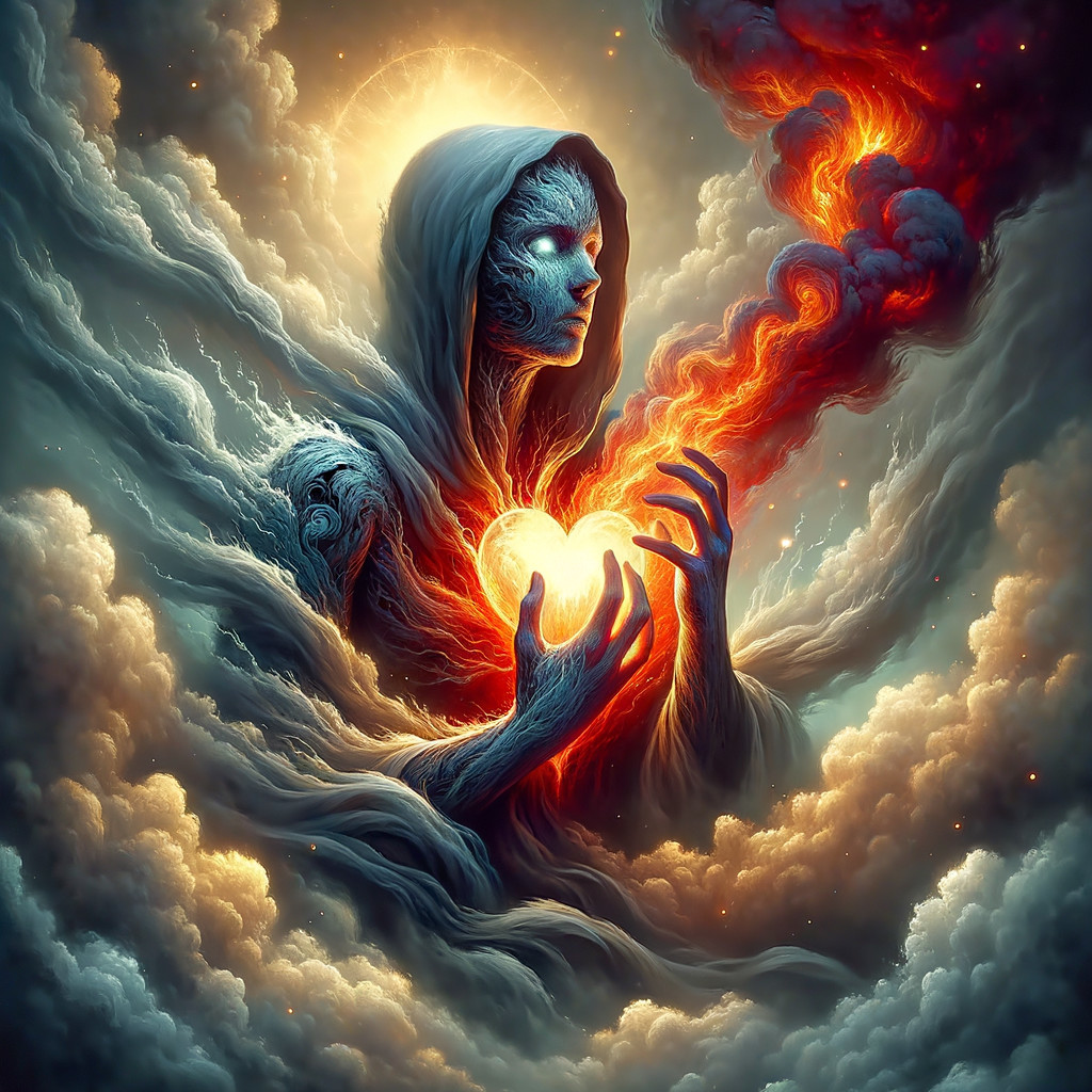 A ethereal figure cloaked in smoky clouds cradles a glowing heart, surrounded by swirling flames and celestial light, evoking themes of creation, passion, and mysticism.