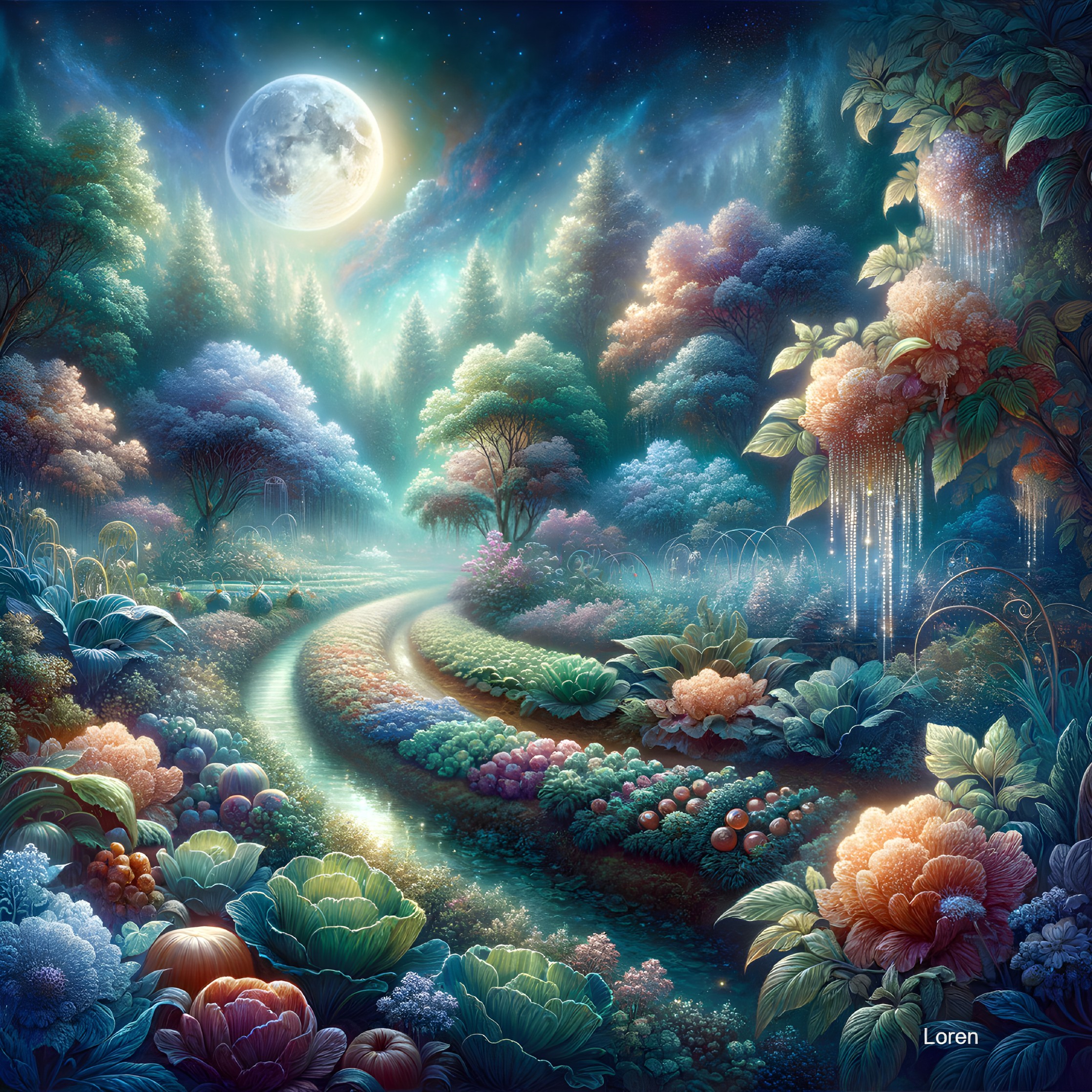 A vibrant fantasy garden under a full moon, with a winding path, lush flora, and twinkling starry sky.