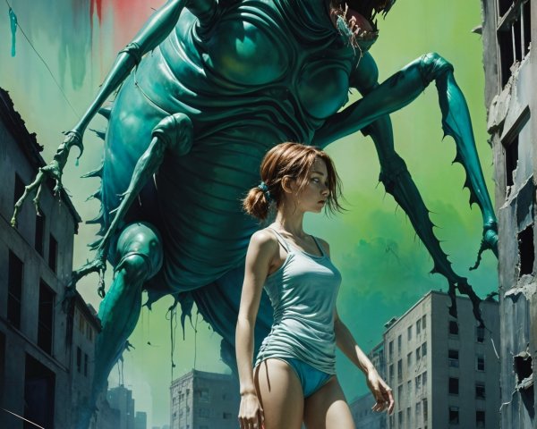 A graceful ballerina in a pastel blue dress dances amidst a swirling backdrop of colors and abstract forms, blending elegance with dynamic artistic elements.