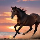 A majestic horse gallops along the shoreline at sunset, kicking up sand as the vibrant colors of the sky reflect on the calm water. The scene captures freedom and beauty in motion.