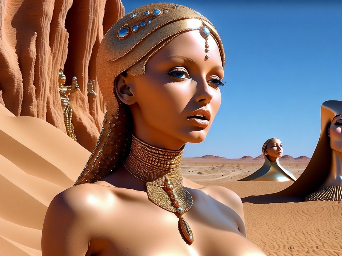 The image features three futuristic figures resembling ancient queens, adorned in shimmering gold and blue accents, set against a vivid desert landscape with striking rock formations.