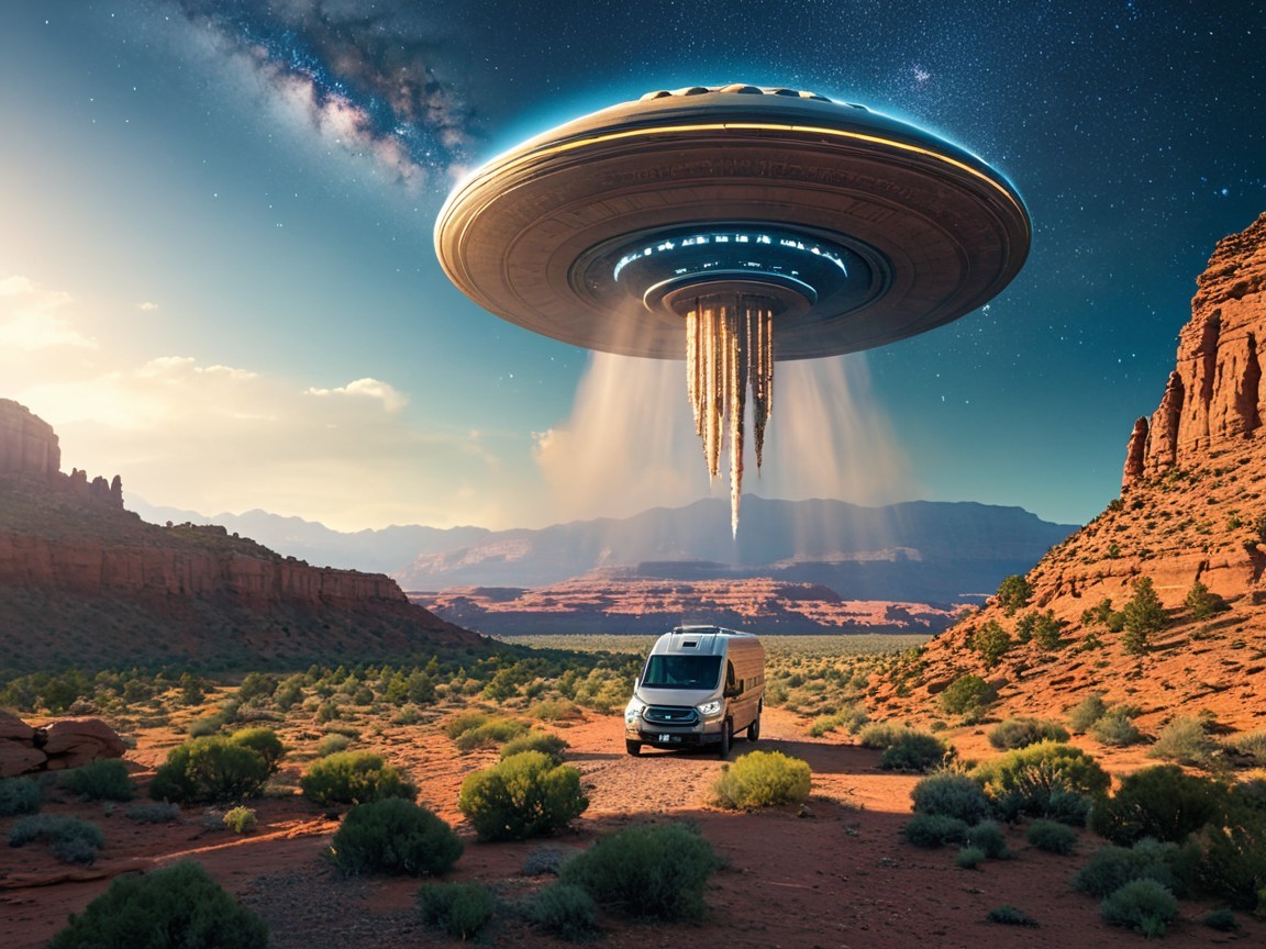 A yellow school bus drives down a desert road as a futuristic UFO hovers above, beams of light shining down. The scene merges school life with a sci-fi touch under a starry sky.