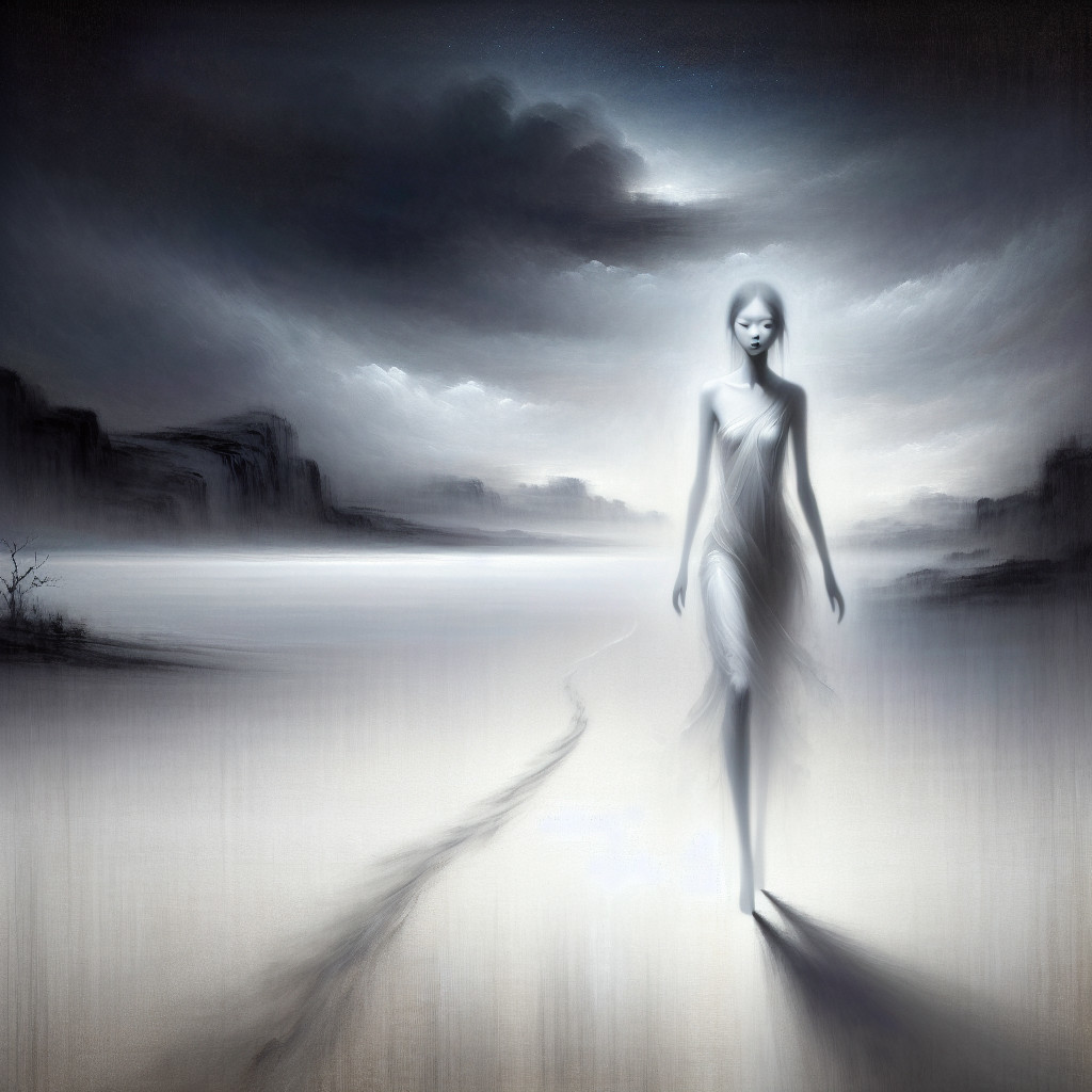 Prompt: "Ghostly thin lilliputian figure with ethereal wispy body dissolving behind as she walks towards the viewer, milky translucent skin, thin arms and legs, vast open night sky, traditional Chinese ink painting style, emotional depth, sense of isolation, minimalistic white background, evocative brushstrokes, atmospheric perspective, serene and melancholic ambiance, dark void background, deep artistic concept, blurred depth of field, contemplative mood"