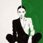 The image features a woman seated in a striking half-black, half-white suit against contrasting backgrounds. Her expression is confident, embodying elegance and modernity in a minimalist style.