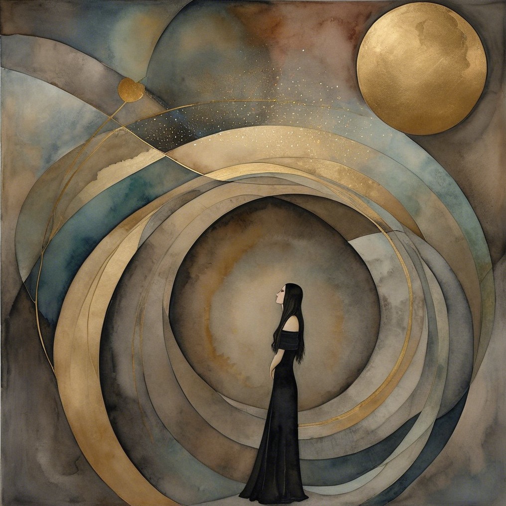 A serene, stylized woman gazes forward, framed by swirling blues and golds. Two golden spheres float above, enhancing the mystical and contemplative aura of the artwork.