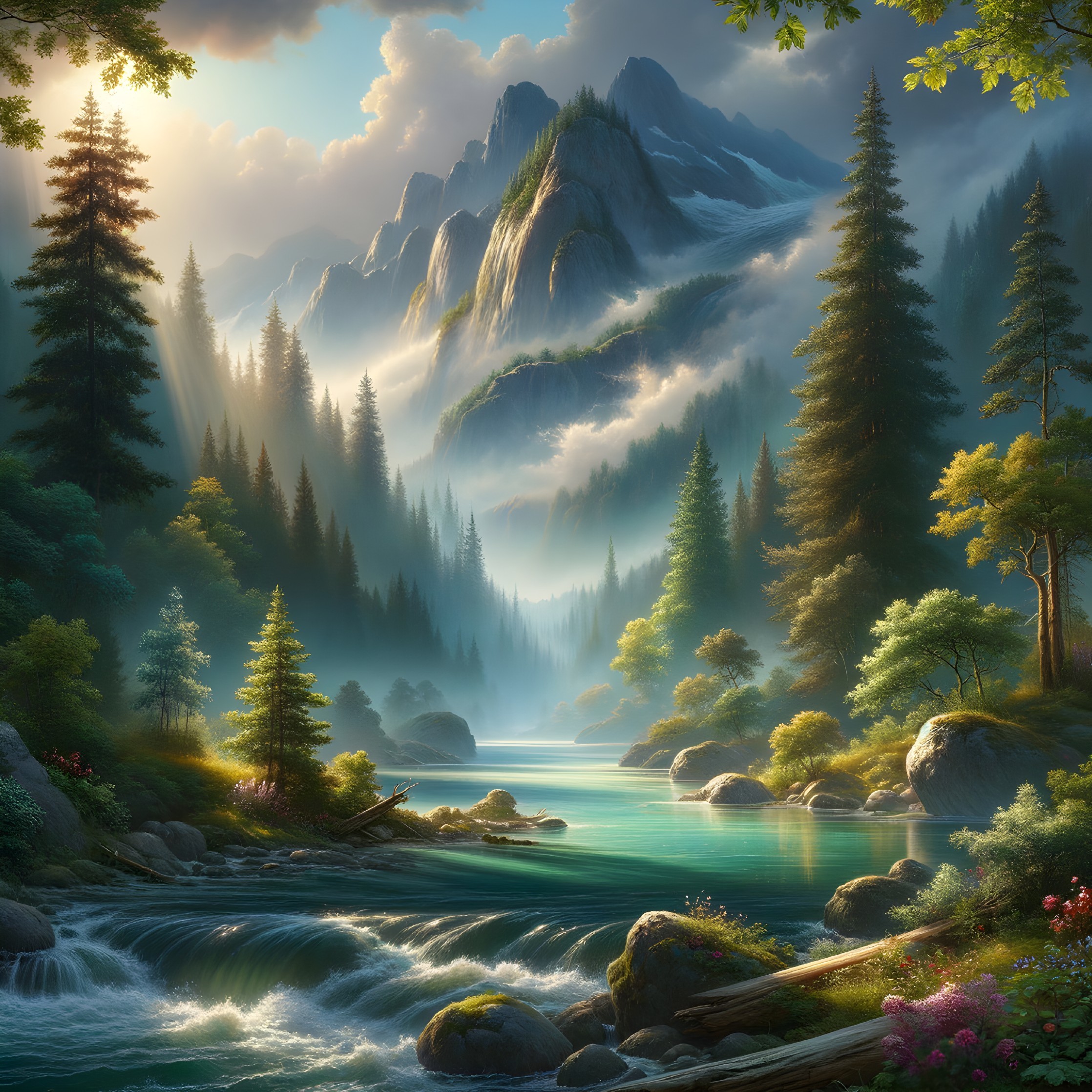 A serene landscape features a tranquil river flowing through a lush forest, surrounded by majestic mountains. Soft sunlight filters through misty clouds, creating a peaceful, dreamlike atmosphere.