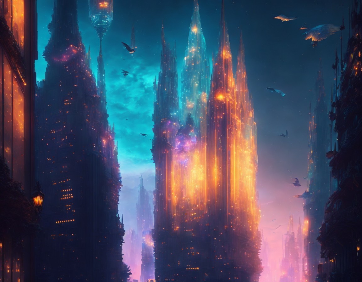 An ethereal futuristic city with towering luminous skyscrapers, flying vehicles, and a radiant dusk sky.