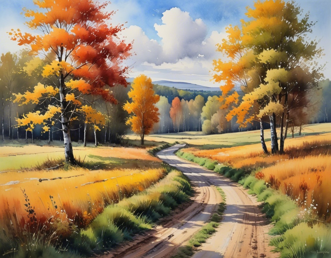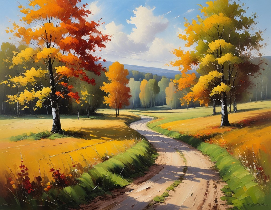 A vibrant autumn landscape with a winding dirt road, colorful trees in shades of orange and yellow, under a clear, blue sky with fluffy clouds.