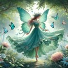 A graceful fairy with large green wings dances in a lush, enchanted forest. Surrounded by vibrant flowers and fluttering blue butterflies, she exudes magic and serenity.