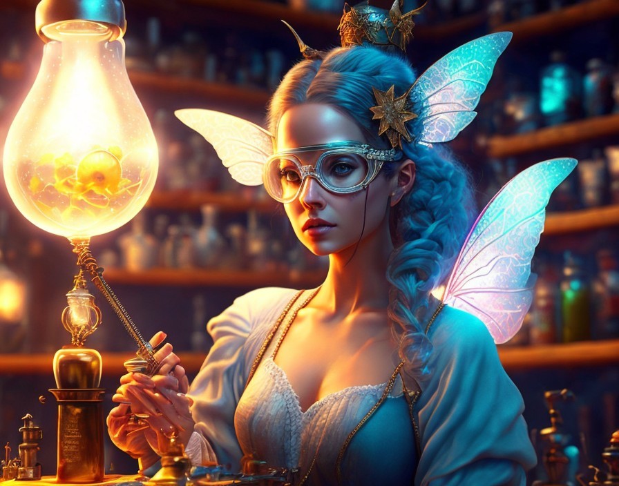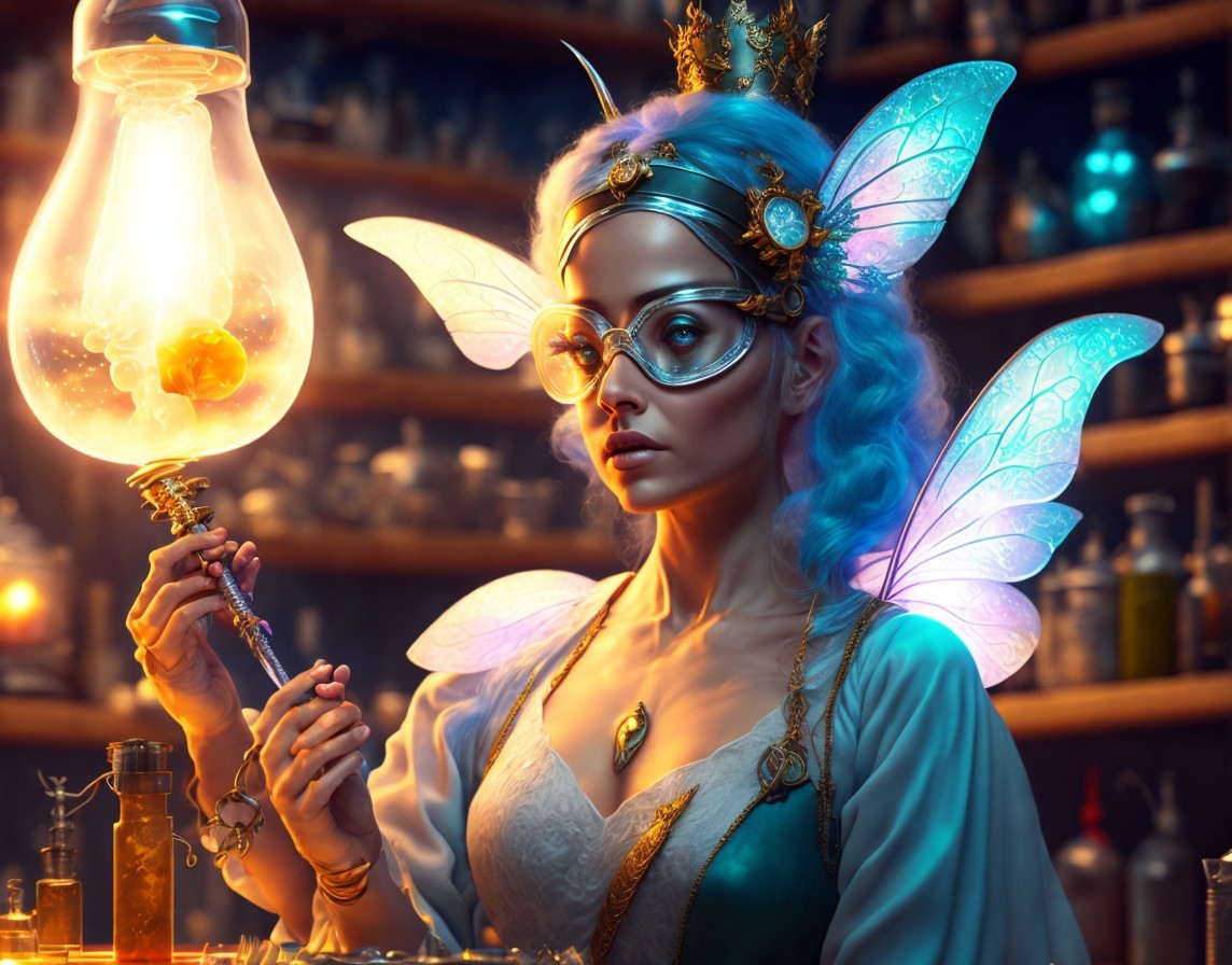 A fantastical image of a fairy with glowing wings and intricate headgear, holding a luminous bulb amidst potion-filled shelves.