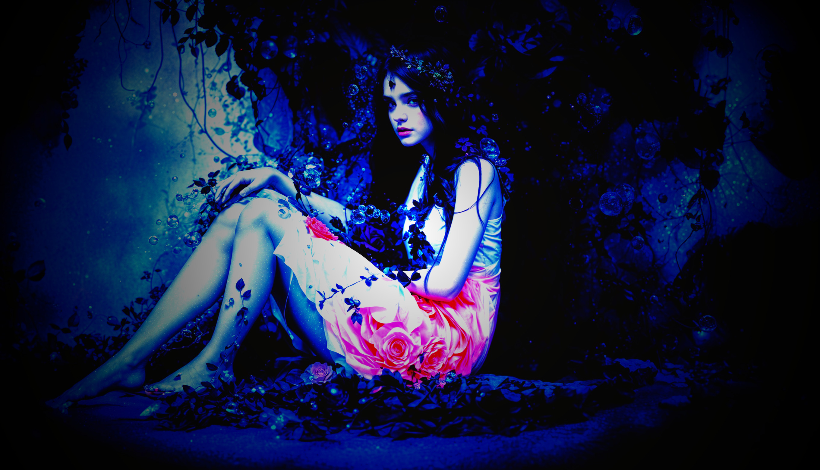 A young woman sits against a backdrop of dark foliage and flowers, wearing a white dress with pink roses. The scene is illuminated in deep blue hues, creating a mystical atmosphere.