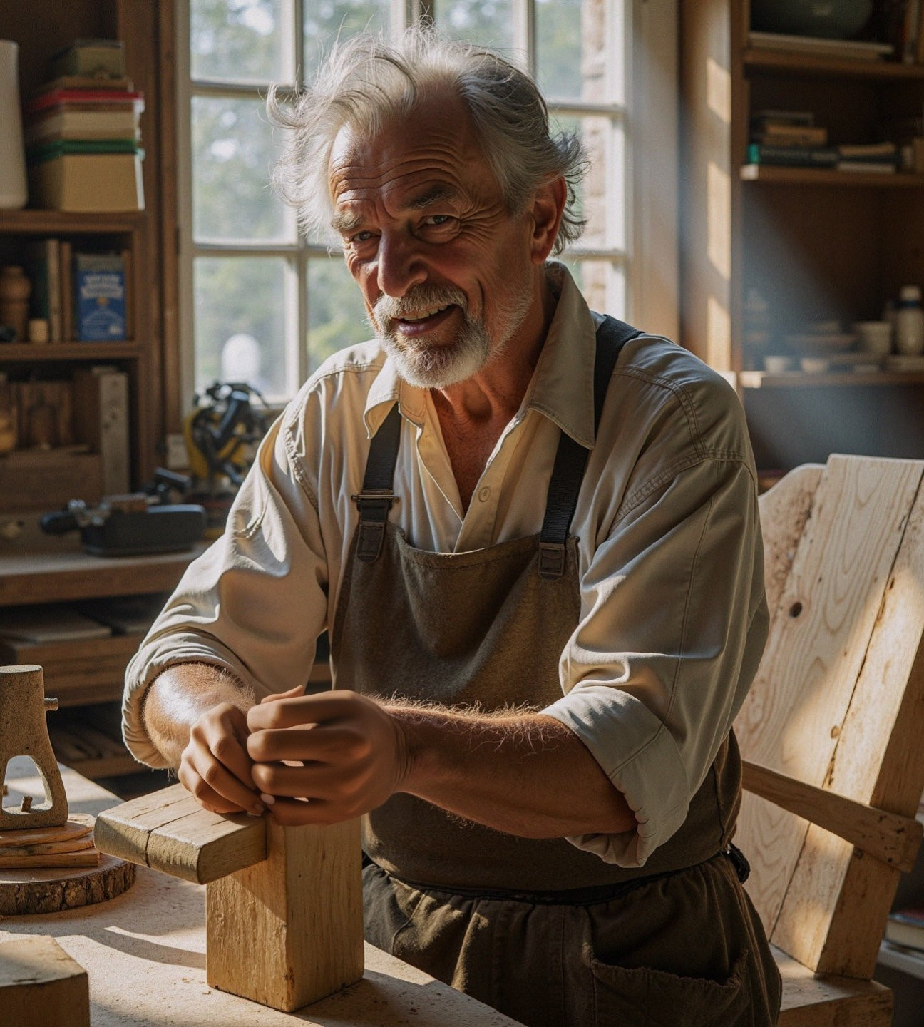 A skilled carpenter focuses intently on shaping wood in a sunlit workshop, surrounded by tools and wooden pieces, exuding a sense of craftsmanship and dedication.