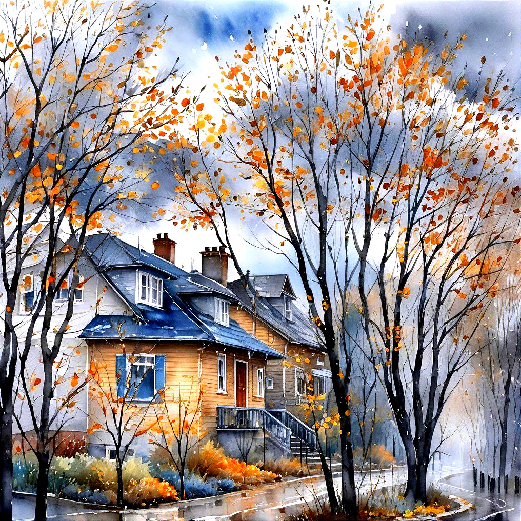 A serene autumn scene featuring charming houses surrounded by trees with vibrant orange leaves. Overcast skies hint at rain, creating a cozy, tranquil atmosphere in the neighborhood.