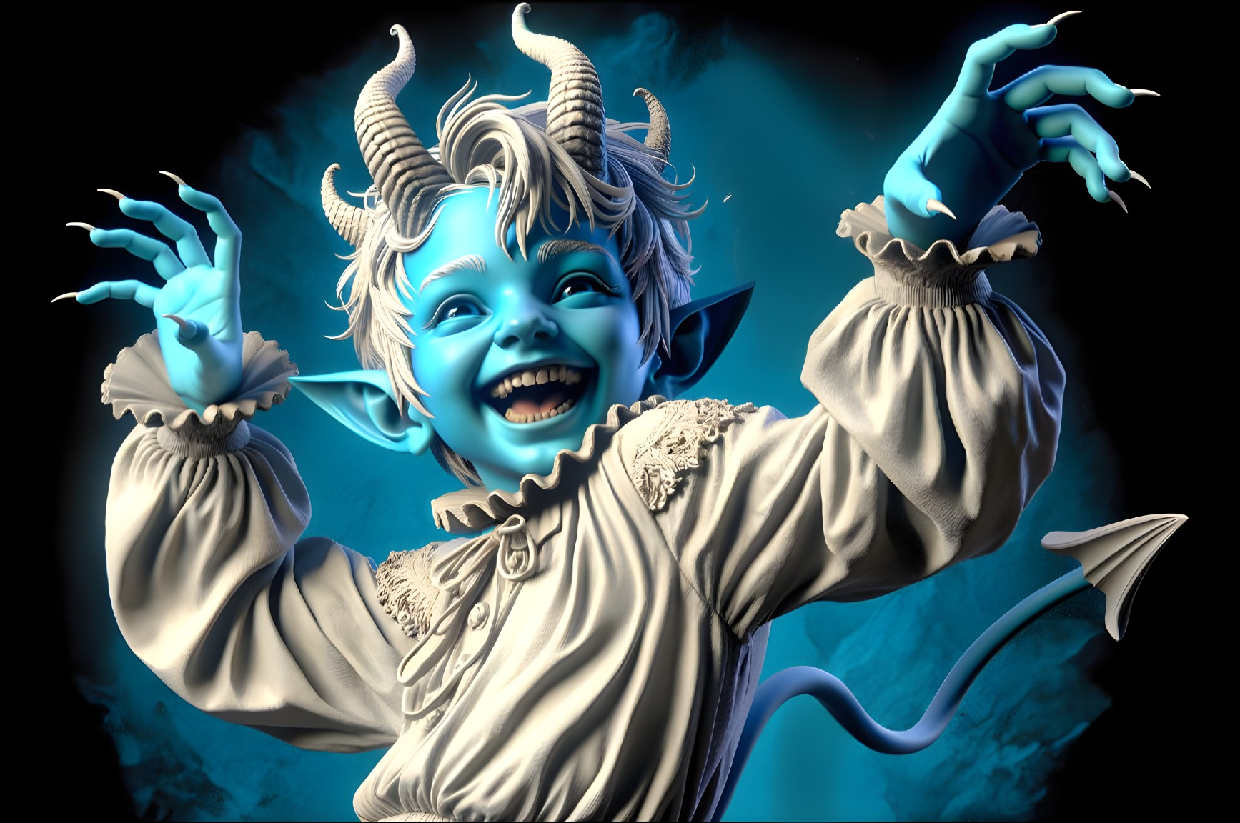 A vibrant and playful artwork featuring a cheerful blue faun girl in a devilish pose, showcasing intricate details and vivid colors in a photorealistic 4K 3D format.