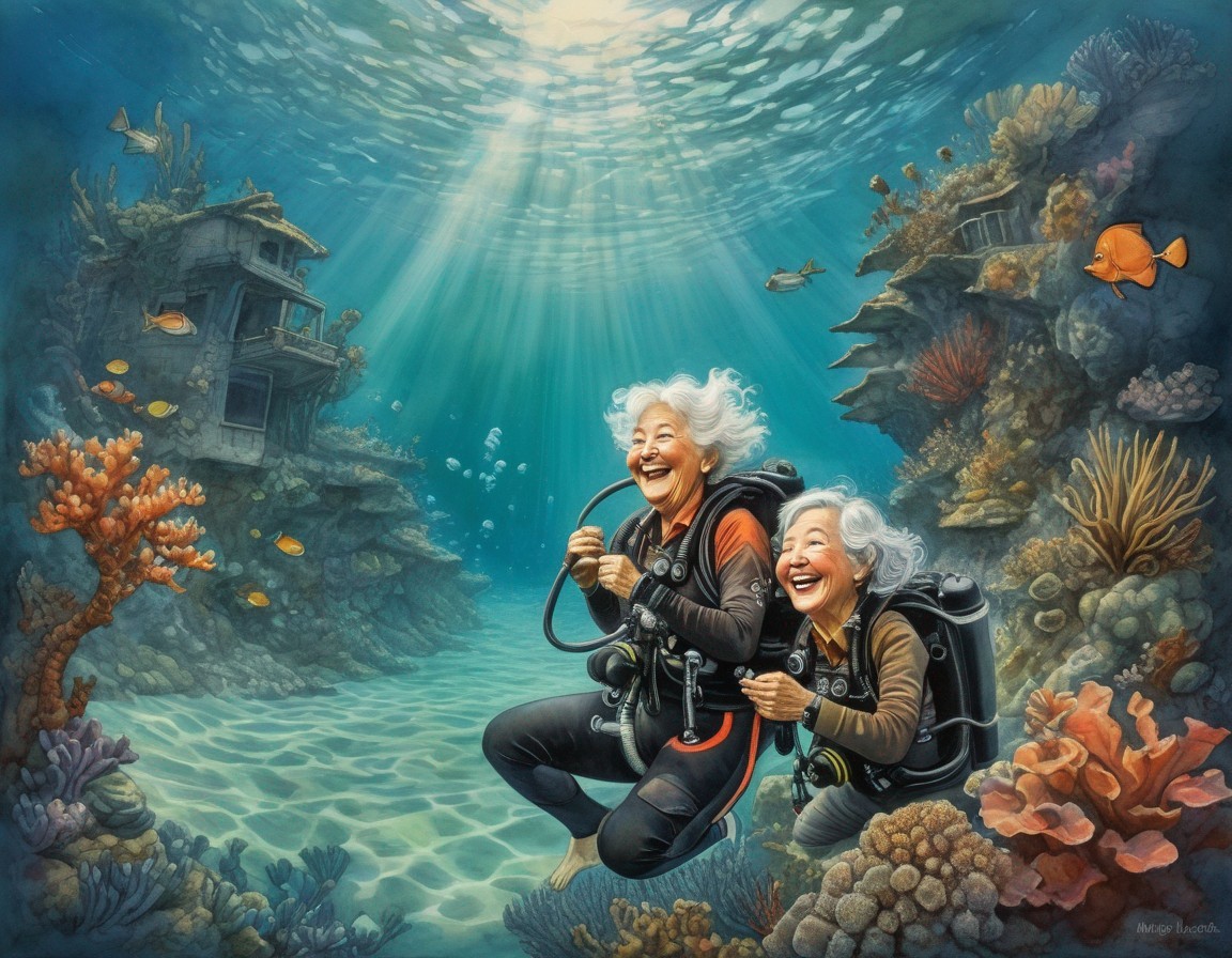 Two elderly women scuba diving among colorful coral and fish with submerged huts in the background. They appear joyful and adventurous.