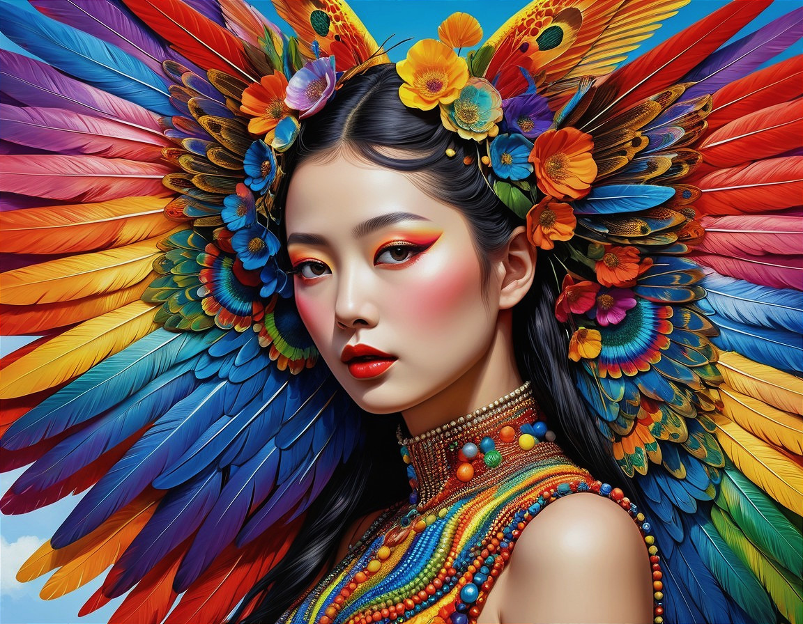 A woman with vibrant, multicolored feathered wings and floral adornments creating a vivid, artistic display.