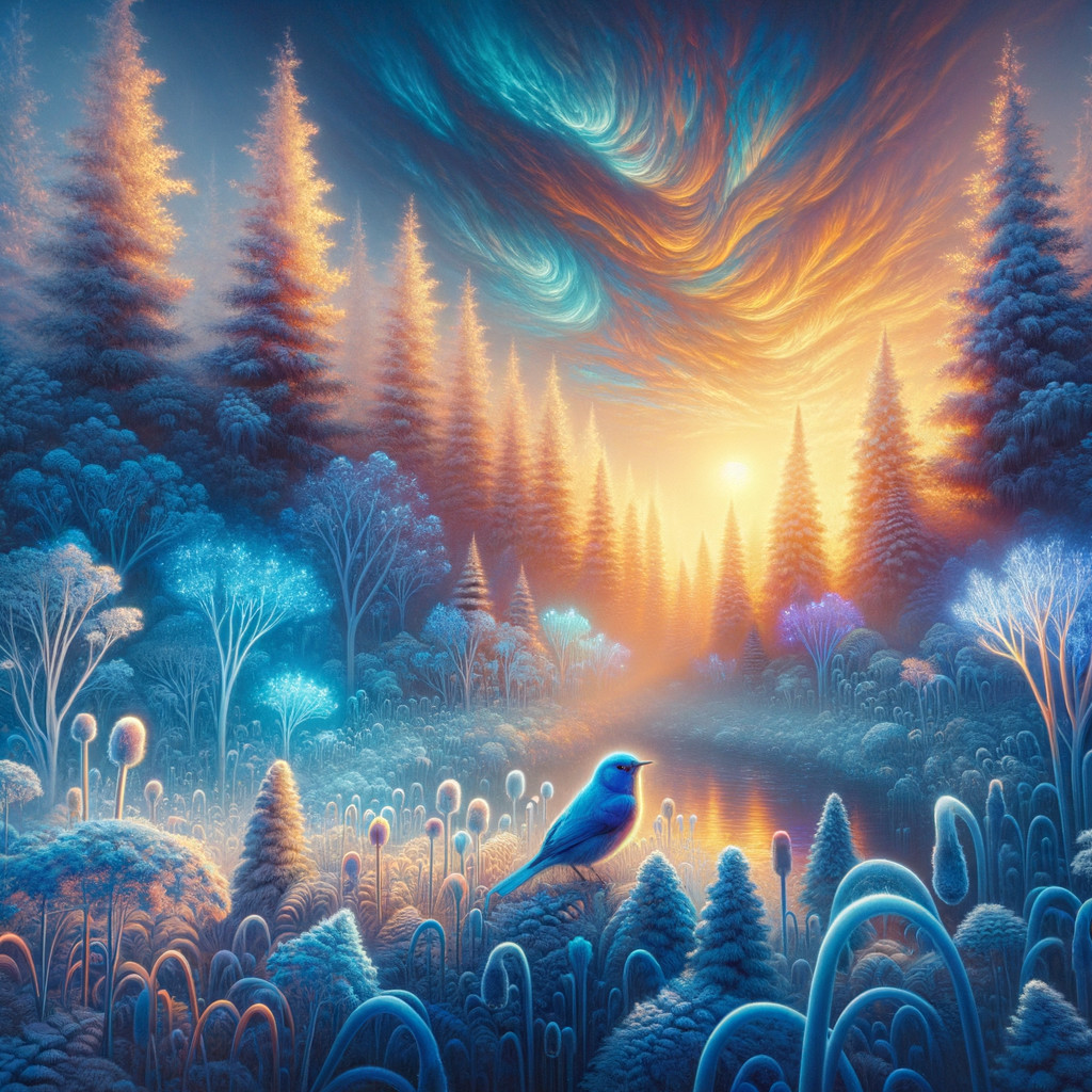 Evolve! Excellent quality! beautiful blue bird surrounded with beautiful misty sunset clouds, colourfull, magical, beautiful, bioluminescent highlights and atmosphere, winter landscape, beautiful trees and long-limbed plants, art concept by Waterhouse, Carne Griffiths, Minjae Lee, Ana Paula Hoppe, watercolor in silk art, Complex contrast, HDR, unique background, Superimposition, Overprinting, Overlay, Masterpiece. Light rays flooded the sky. 3D art a fusion of Mirko Reisser DAIM's colours and Leandro Erlich's optical illusions. Natural enchantment, where painted and real worlds seamlessly collide, creating a masterpiece of surreal wonder. sharp focus extremely detailed Award-winning photography fantasy 8k ethereal very attractive dynamic lighting fantastic view 4K 3D high-definition crisp quality colourful Otherworldly Delicate, Ambient, occlusion, Transparency, soft mist, Searching for non-obvious connections, masterpiece magical Jean-Baptiste Monge 3D Render wet on silk watercolors Tie-dye visual impact Aldo Di Gennaro hand drawing in the style of Jean-Baptiste Monge, mind blowing surreal landscape