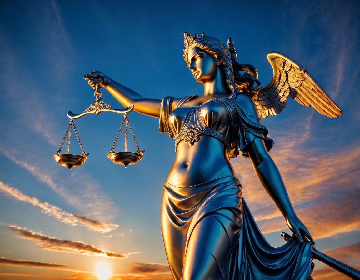 A statue of Lady Justice holding balanced scales against a sunset sky, symbolizing fairness and the law.