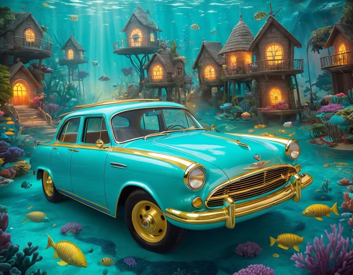A vintage blue car is amidst an vibrant underwater scene with fish, colorful corals, and whimsical thatched houses resembling an aquatic village.