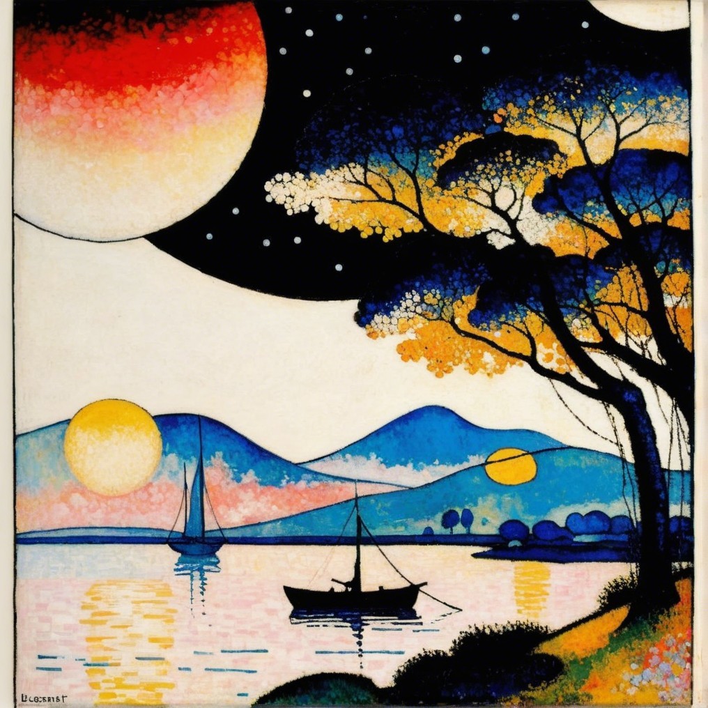 This piece harmoniously merges Impressionism, Symbolism, and Romanticism, inspired by the dreamlike luminance of Seurat, the ornamental richness of Klimt, the atmospheric depth of Turner, and the emotive color palette of Redon. It explores the transformative beauty of light and its ability to connect the viewer to nature's transcendence, blending vibrant color and symbolic imagery into a serene yet otherworldly narrative.