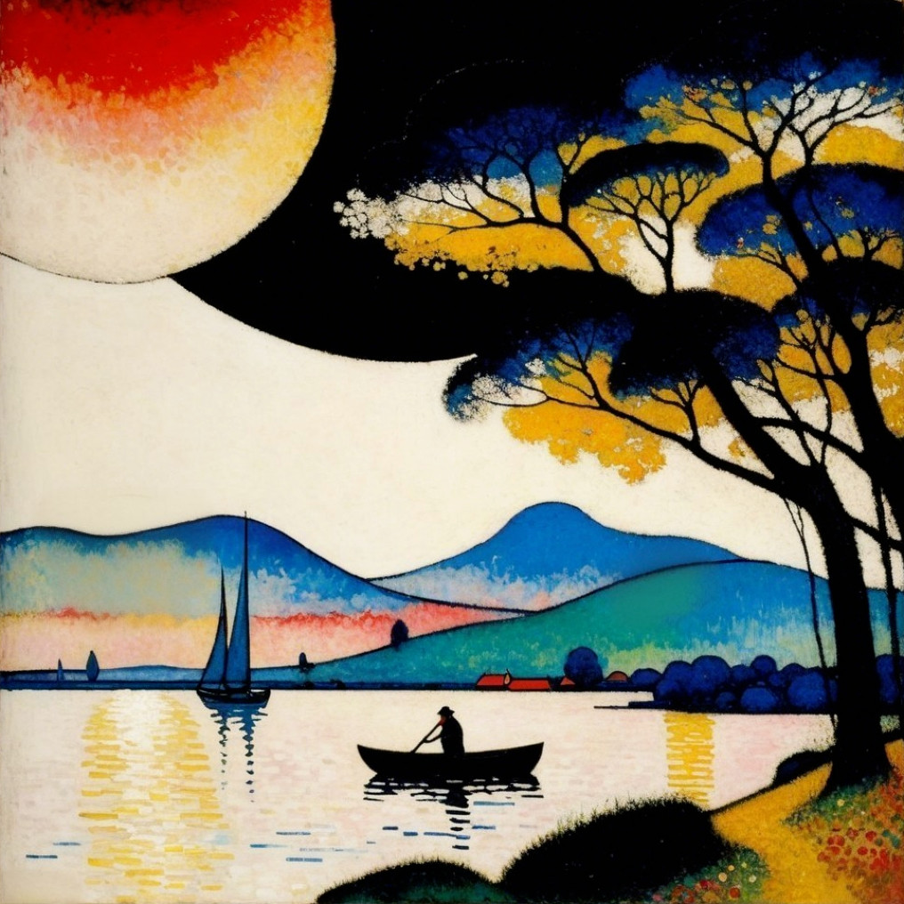 "Serenade of Light and Shadow" is a dreamlike landscape that blends vibrant and soft tones. A glowing oversized sun dominates the sky, casting warm hues across a tranquil lake. A lone rower and a sailboat glide through the water, framed by shadowed trees and rolling hills that transition seamlessly into distant blue mountains. The interplay of light, shadow, and texture evokes a mystical and timeless quality.