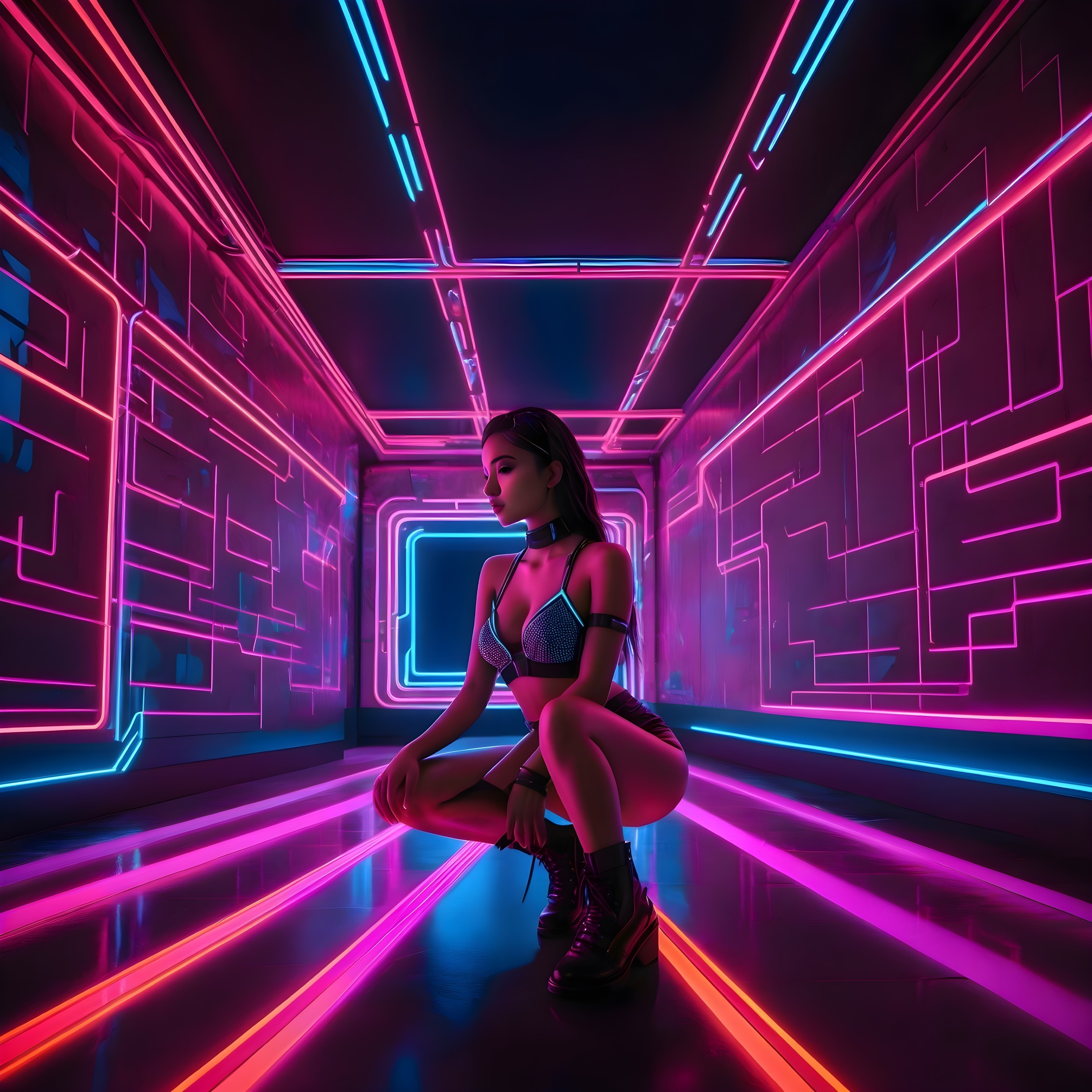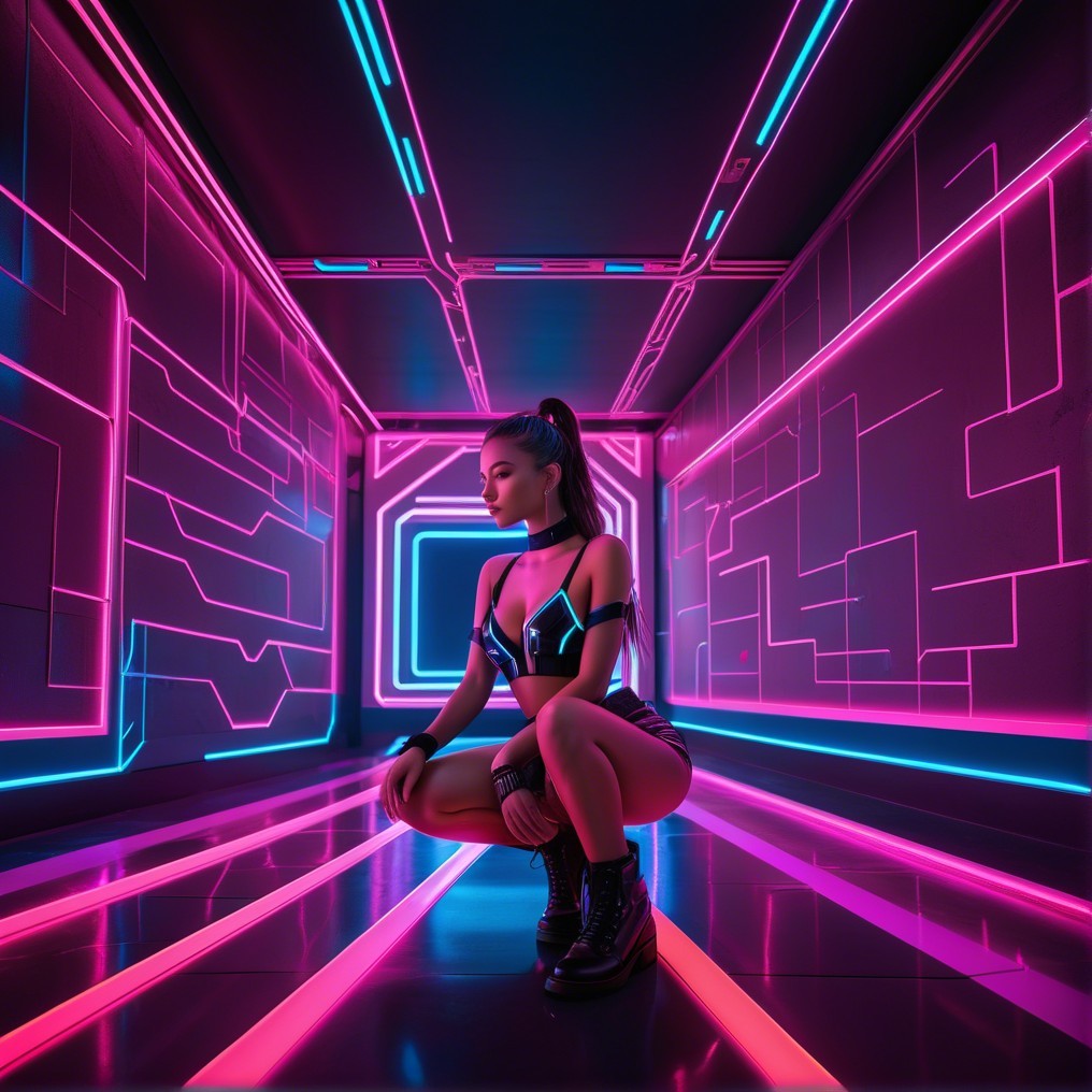 A stylish figure poses in a futuristic hallway, illuminated by vibrant pink and blue neon lights. The scene exudes sci-fi aesthetics with sleek lines and a high-tech vibe.