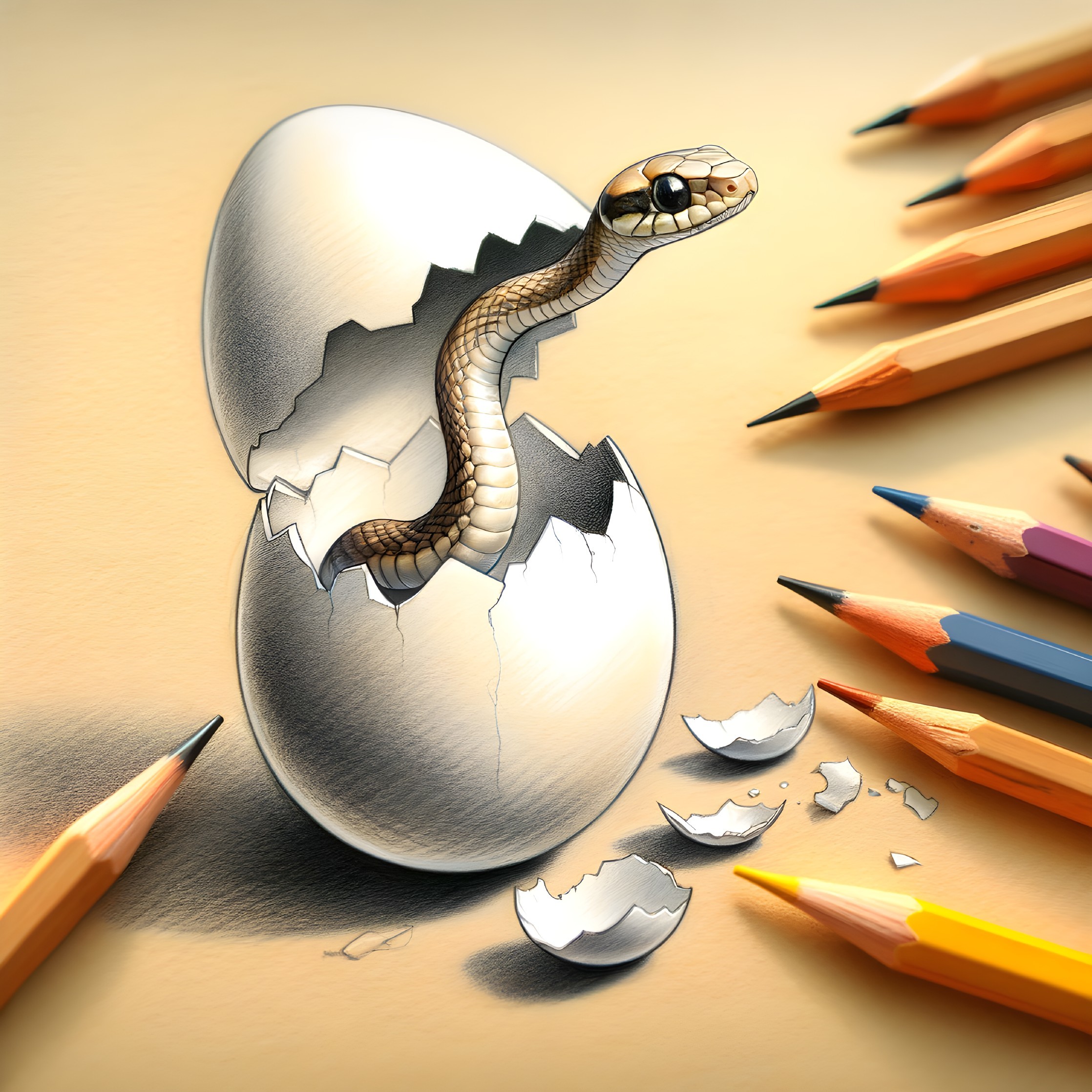 A drawing of a snake hatching from an egg, surrounded by colored pencils on a textured surface.